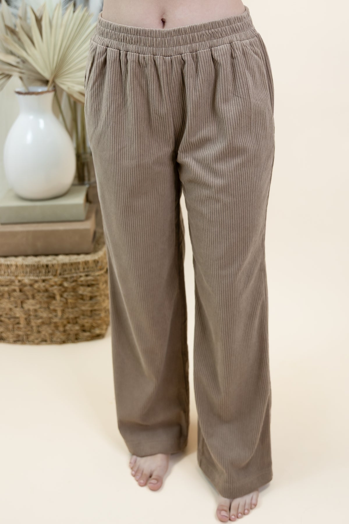 Get cozy and chic in the "Calling It Fate" Pants in warm Mocha. Featuring a comfy elastic waistband and lined side pockets, these corduroy pants bring effortless style with a playful twist. The faux back pocket adds a fun detail while keeping the silhouette sleek. Perfect for relaxed days or casual outings, they’re as comfy as they are cute.