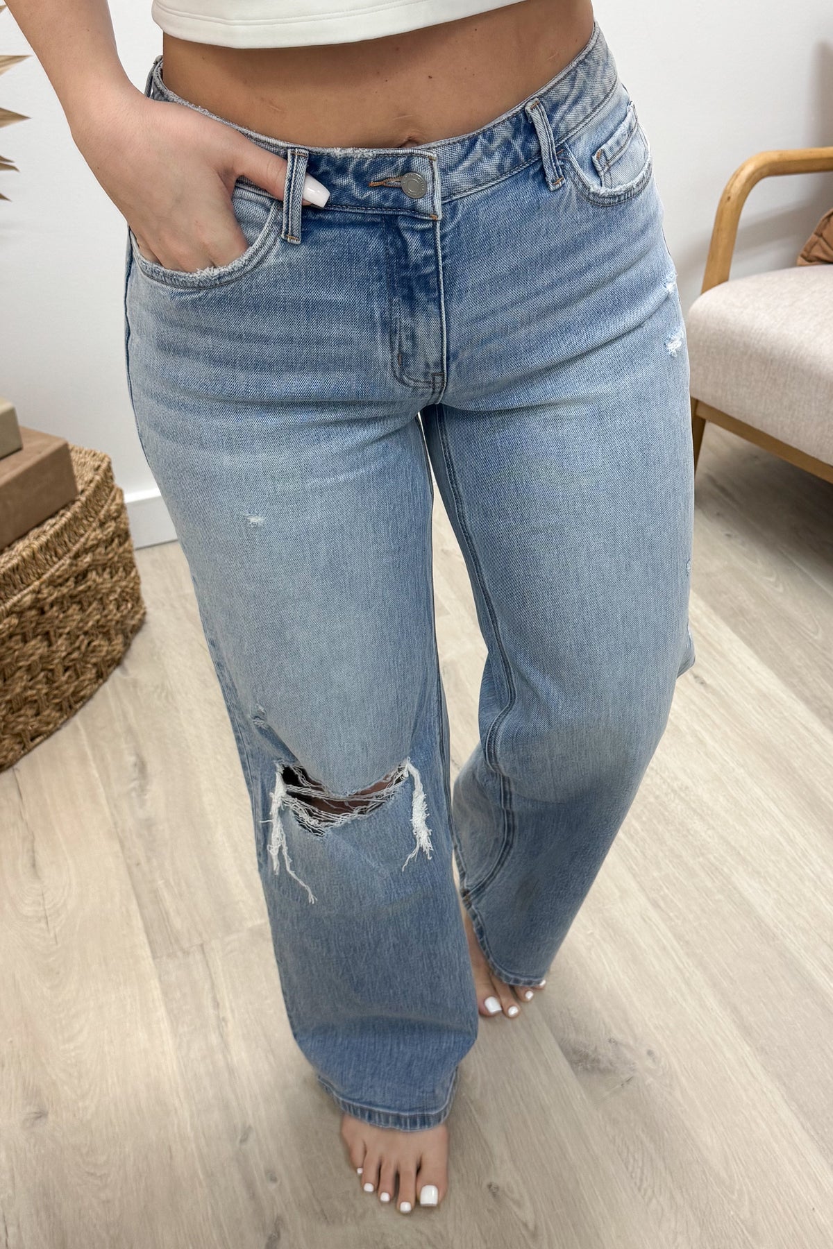 Reese Wide Leg Jeans feature a comfortable stretch denim construction with a flattering mid-rise waist and classic five-pocket styling. The medium light wash pairs beautifully with on-trend distressed detailing for an effortlessly cool look. Cut in a relaxed wide-leg silhouette with a finished hem, these jeans offer all-day wearability without sacrificing style. Perfect for creating versatile outfits that transition seamlessly from casual to dressed-up occasions.