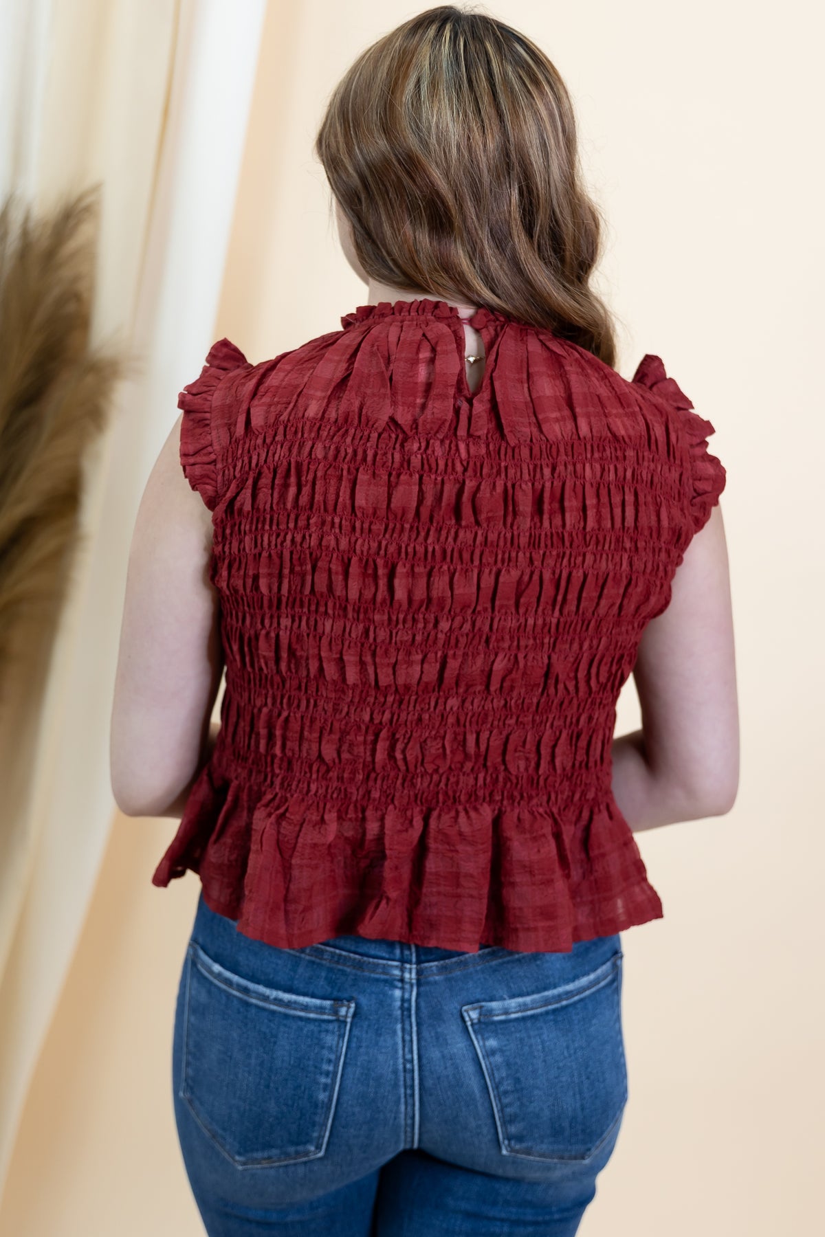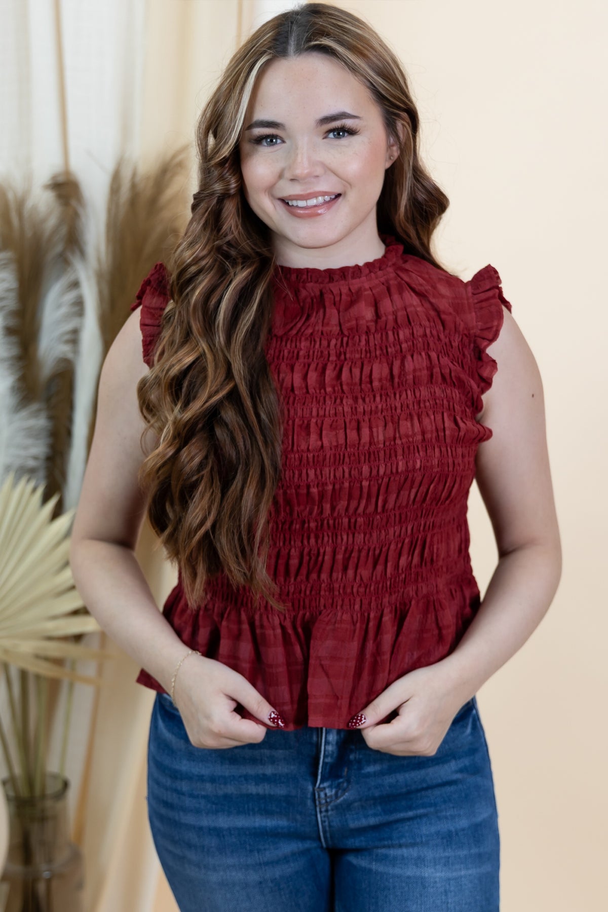 Get ready to turn heads with the "At The Right Time" Top in rich burgundy! This sleeveless beauty features charming ruffle details and a smocked neckline that adds a flirty touch. Lightweight and comfy, it’s perfect for sunny days or layering when the temperature drops. Effortlessly chic with a playful vibe—wear it and watch compliments roll in!