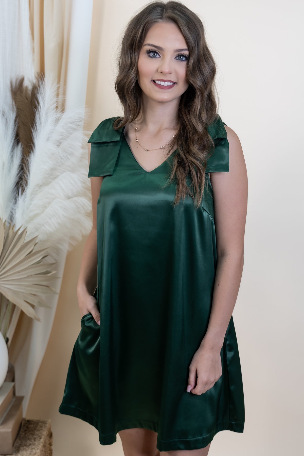 The "Graceful Ties" Dress in hunter green is a fun and flirty sleeveless mini with charming bow accents on the shoulders and a chic V-neckline. Lightweight and fully lined, this woven dress stays comfy and non-sheer, while handy side pockets keep your essentials close. Perfect for twirling through any day or night with playful elegance!