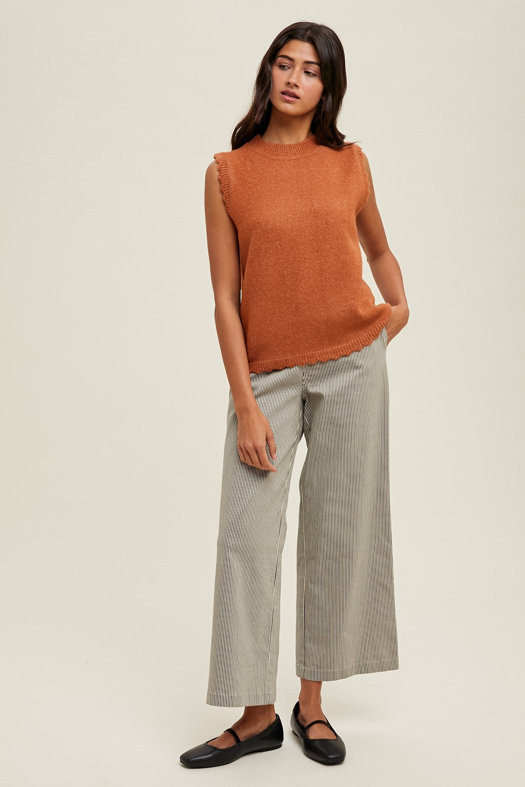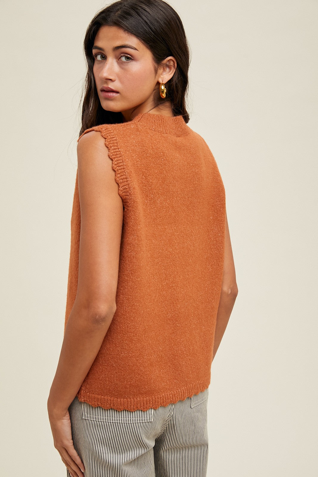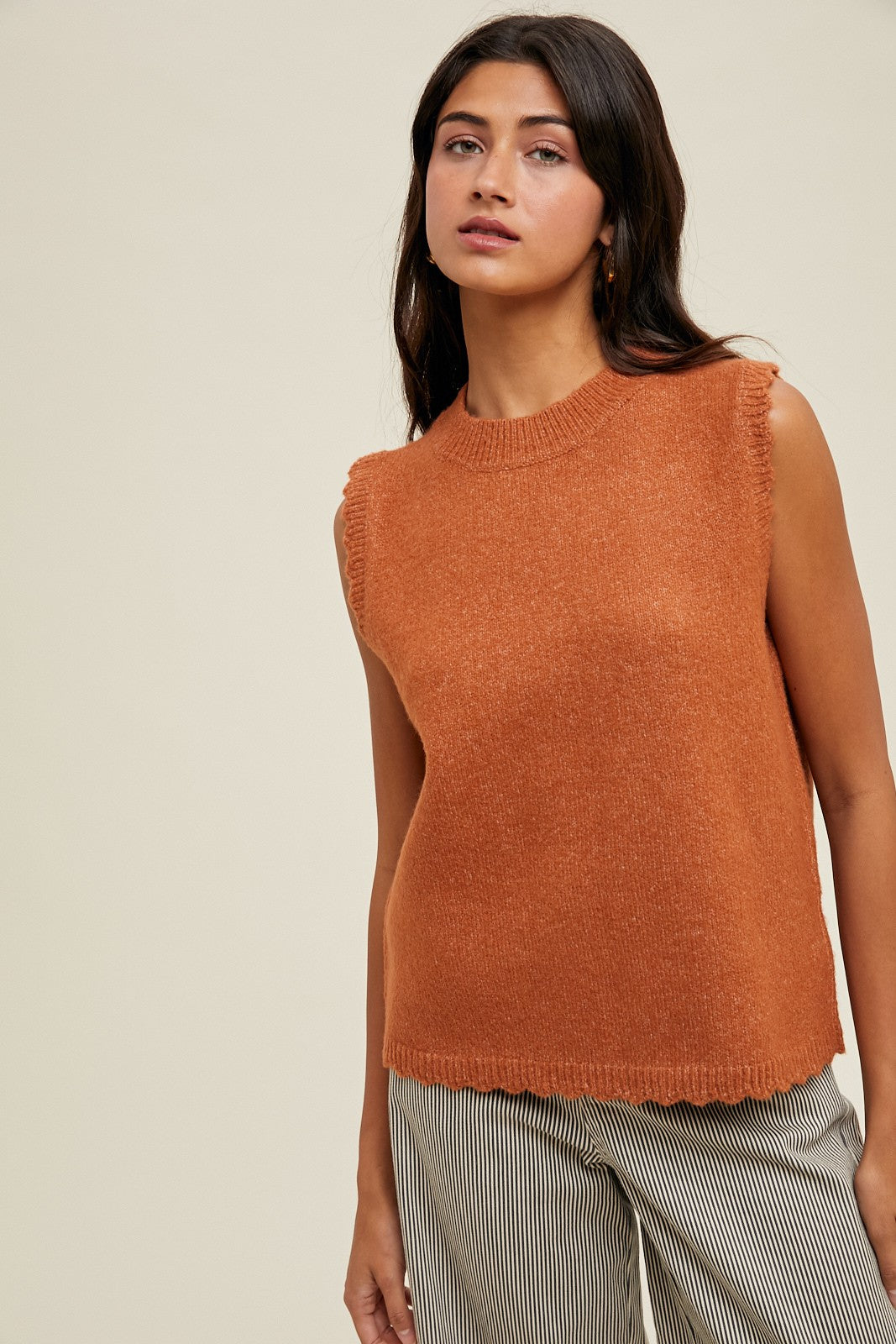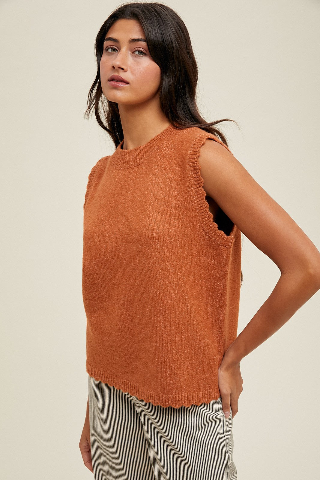 Bring a playful touch to your outfit with the "A Different Day" Tank in Rust. This scalloped knit sweater vest combines cozy texture with a fun, flirty edge, making it perfect for layering or wearing on its own. Its warm rust color adds a lively pop, brightening up any look with effortless charm.