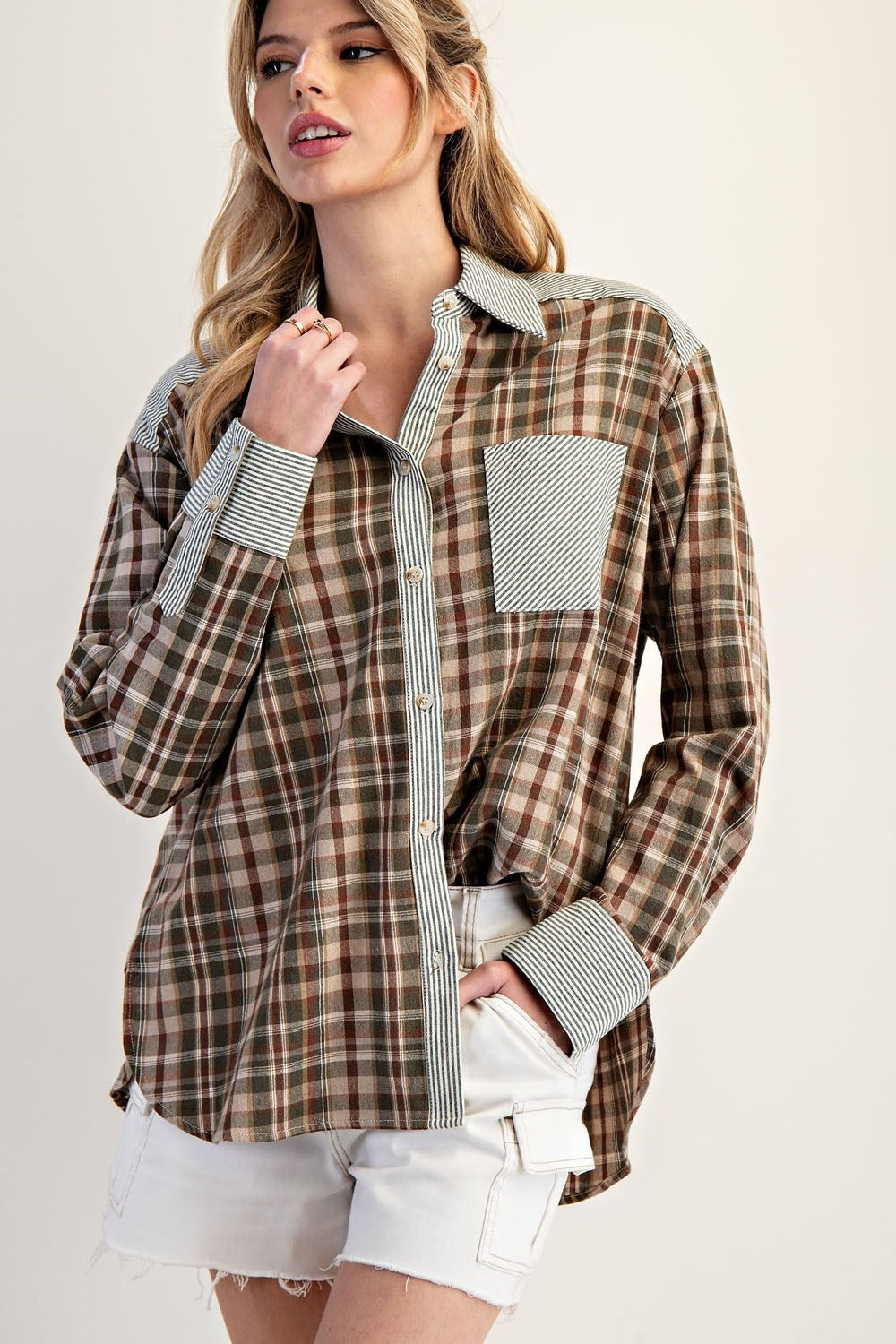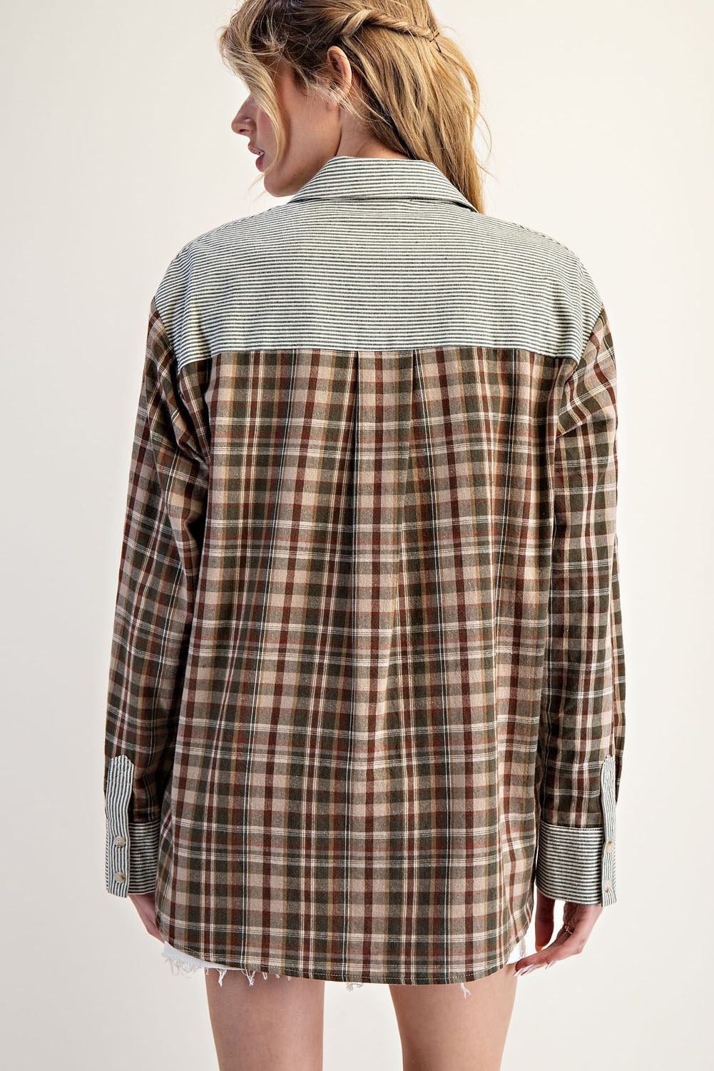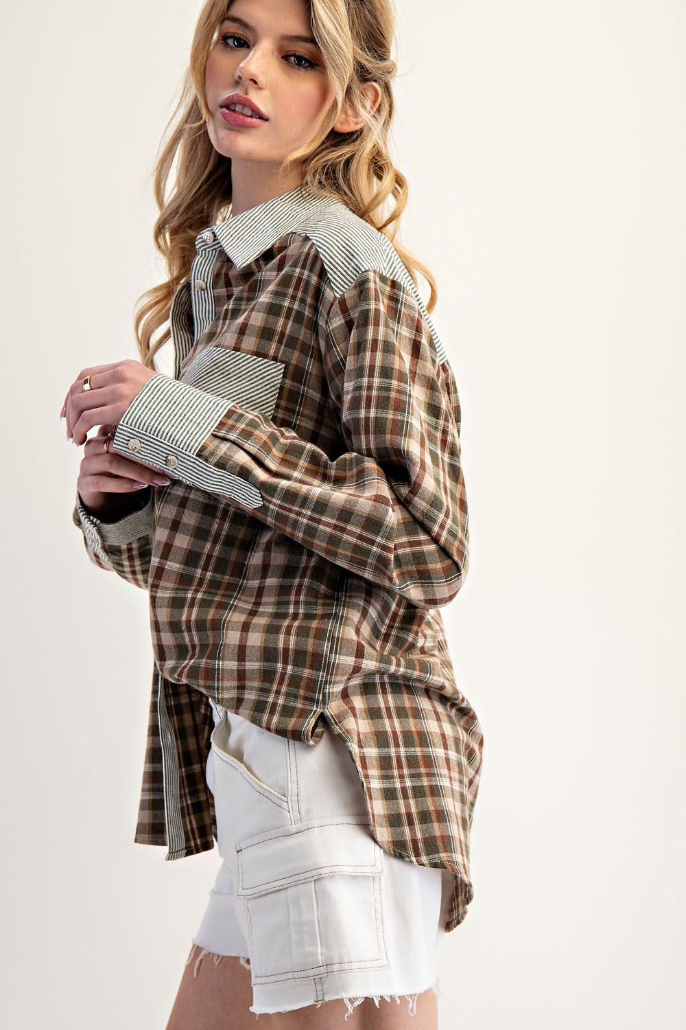 Bring cozy vibes to your wardrobe with the "All You Do" Button Up in Forest. This playful long-sleeve flannel features a fun striped color block design that adds a pop of personality to your look. Perfect for layering on chilly days, it’s soft, comfy, and ready for all your adventures. Whether you’re out exploring or just lounging, this flannel keeps you stylishly snug.