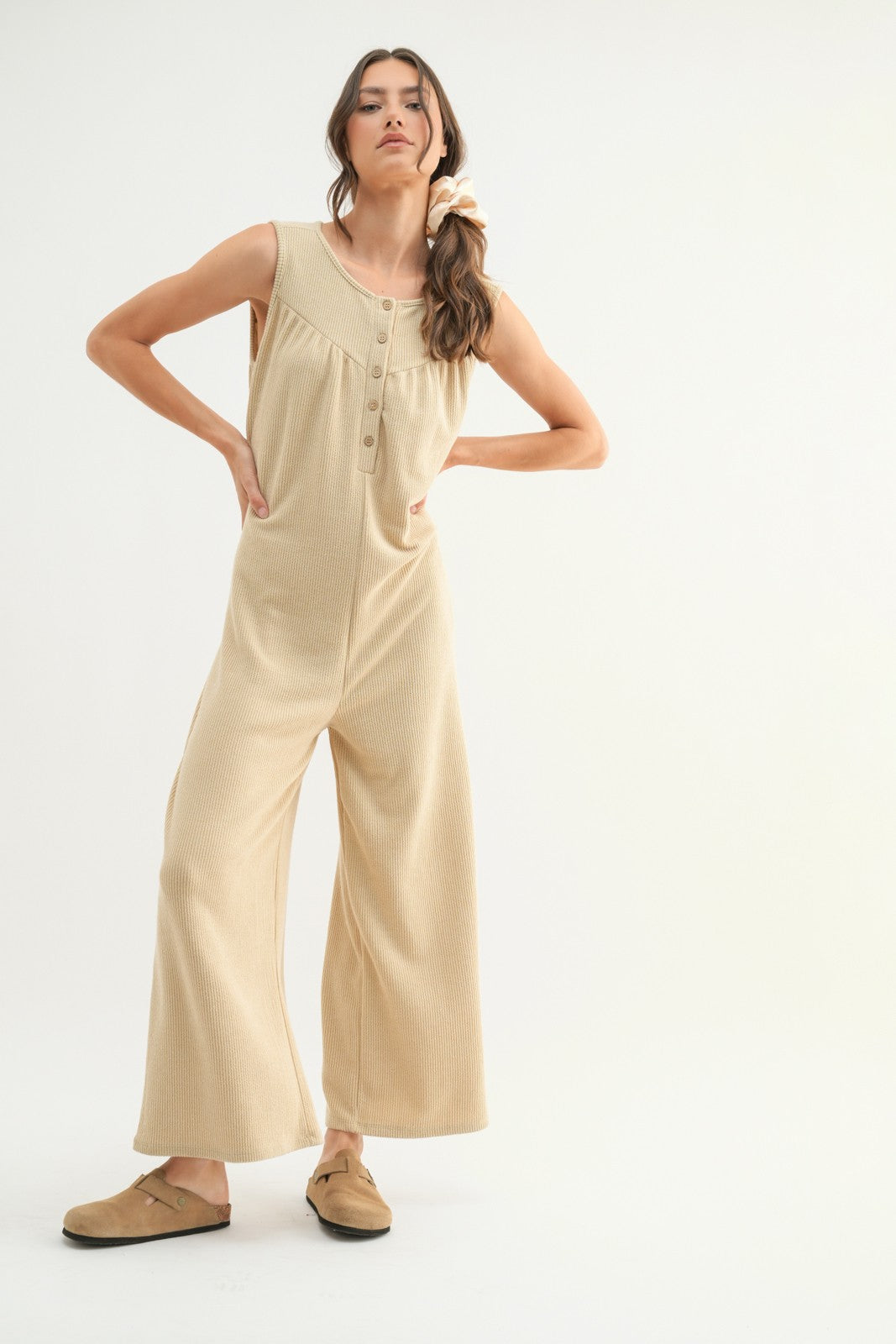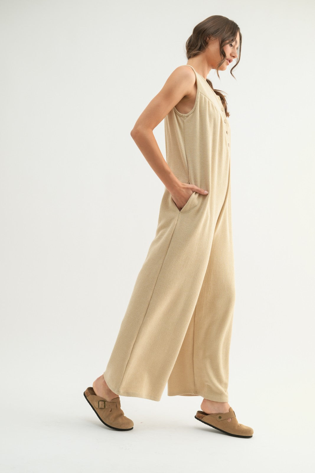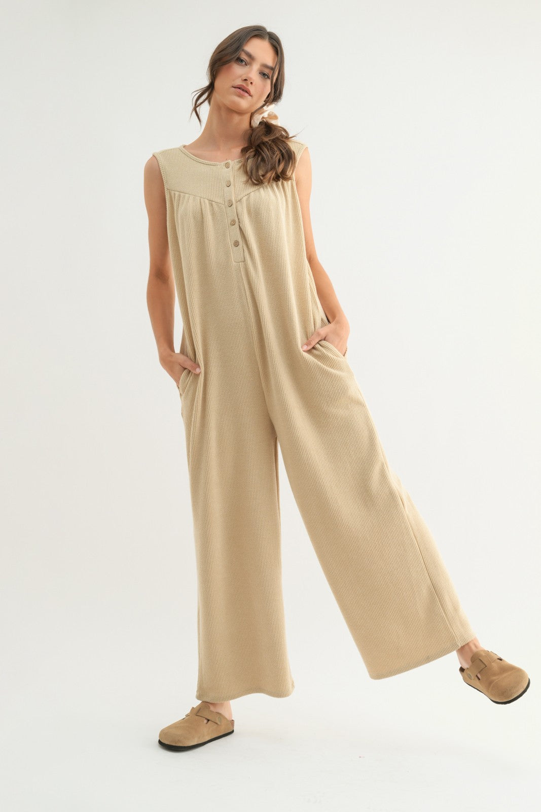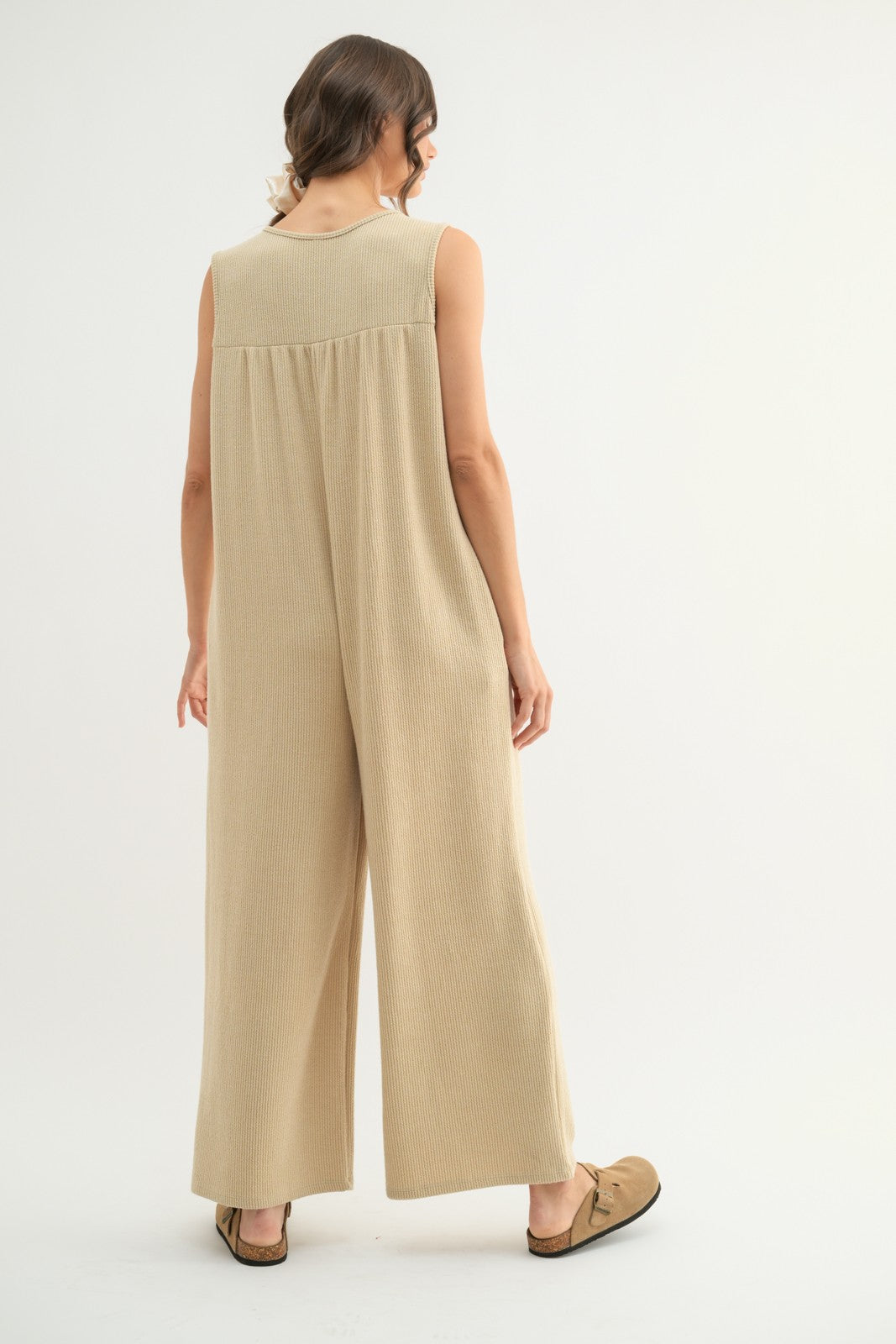 Slip into the "Peaceful Feelings" Jumpsuit and enjoy the perfect blend of comfort and style. This ribbed knit wide-leg design features functional buttons and handy side pockets, making it as practical as it is playful. Whether you're lounging or out and about, this jumpsuit keeps you feeling cozy and effortlessly chic.