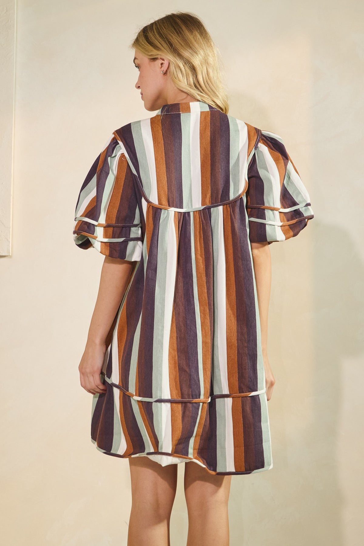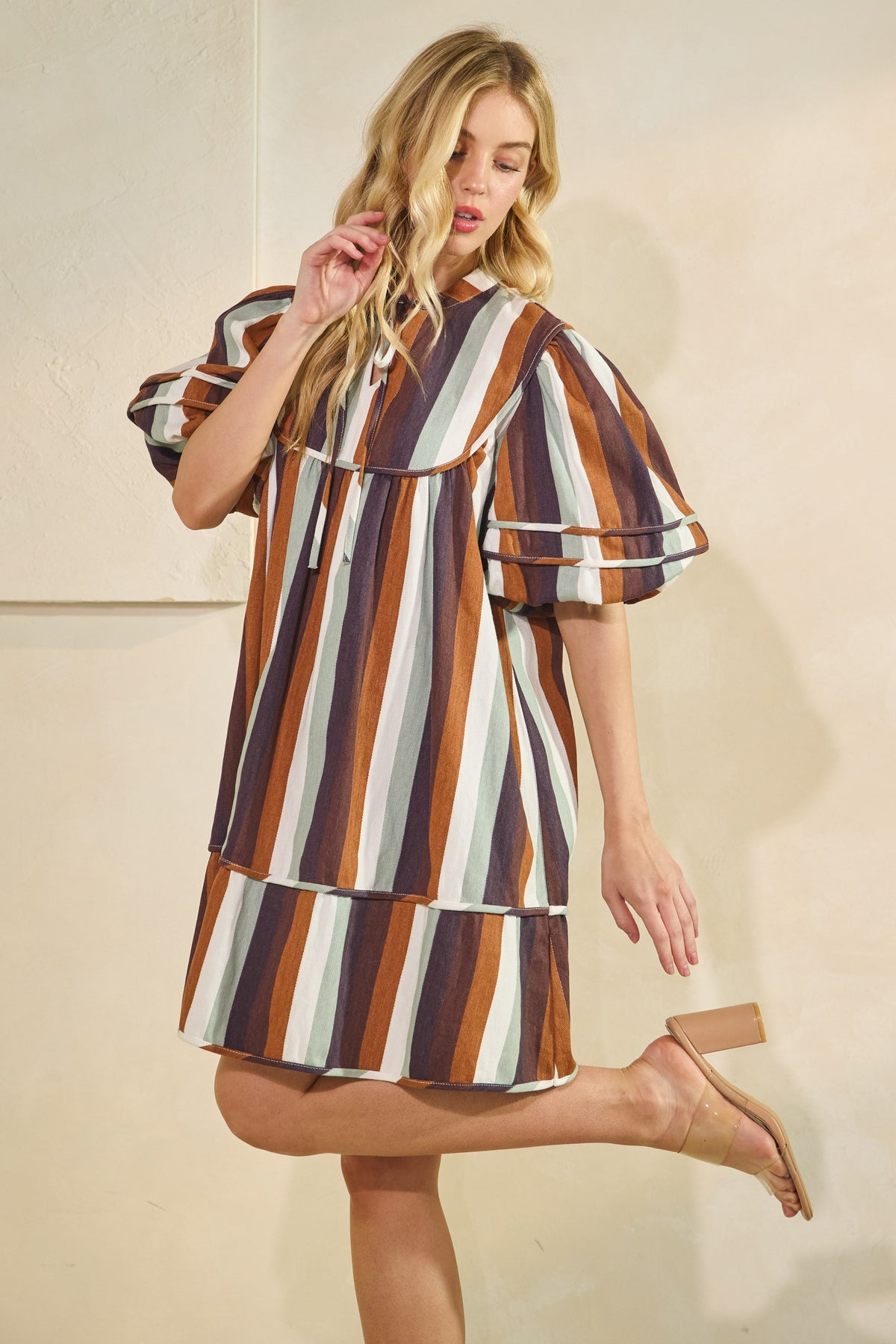 This "Sweet Surprises" dress in brown multi features playful multicolor stripes that brighten any occasion. Its puff sleeves add a charming touch, while the self-tie keyhole neckline offers adjustable comfort and a flattering fit. Perfect for warm days or casual outings, this mini dress combines style and ease to keep you feeling confident and comfortable.