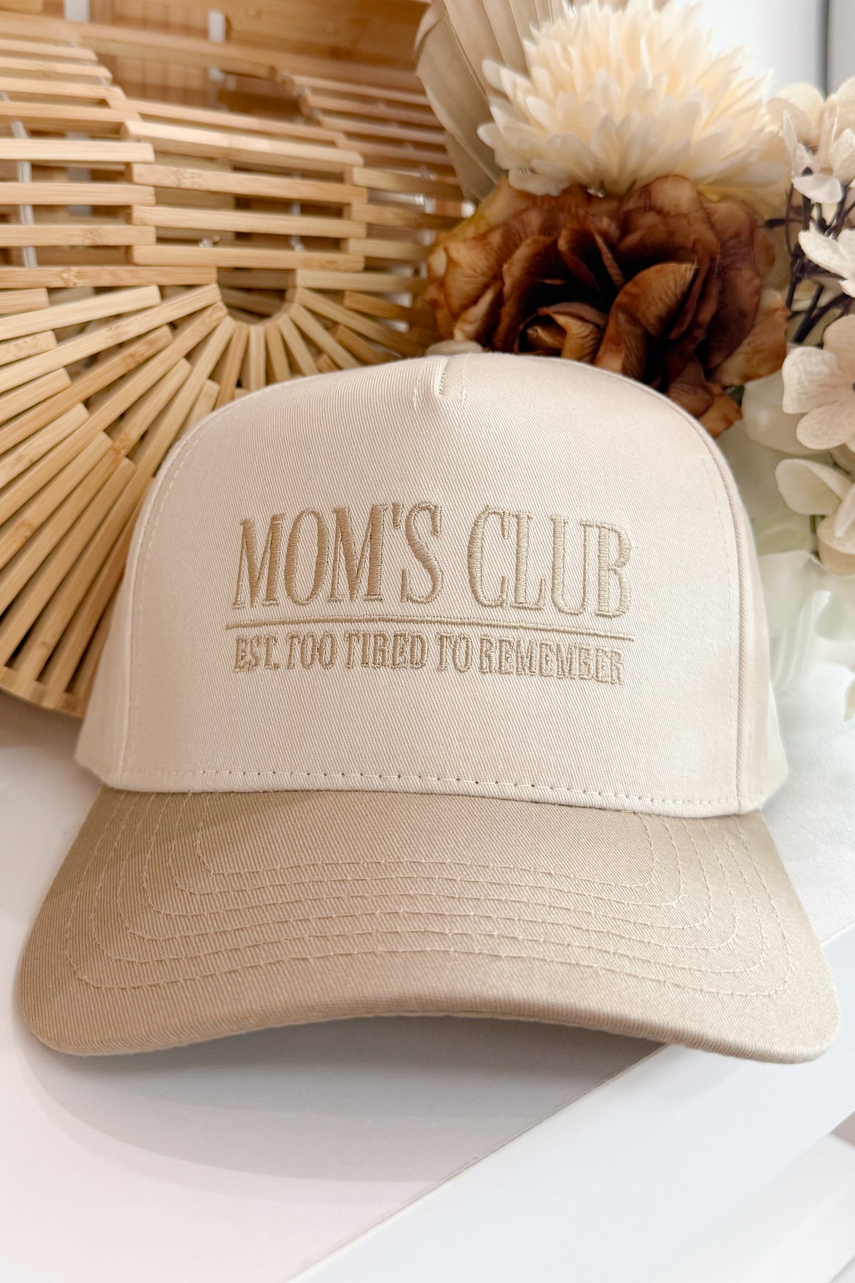 Join the coolest club in town, Mom's Club! This tan and natural trucker hat features a playful "EST. too tired to remember" embroidery, perfect for moms who don't take themselves too seriously. Keep it stylish and fun while showing off your momhood.