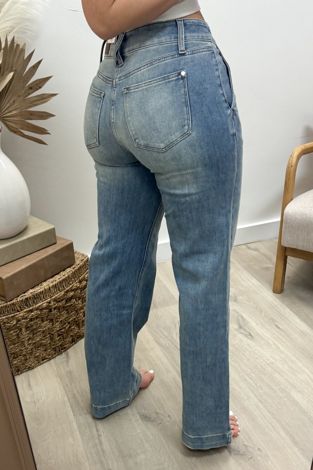 Step into effortless style with the Delilah Wide Leg Jeans. Featuring a high waist and a double button waistband, these light wash jeans offer a flattering fit that hugs your curves just right. The wide leg design adds a breezy, playful vibe perfect for any casual day out. Comfortable and chic, they’re your new go-to for mixing comfort with cool.