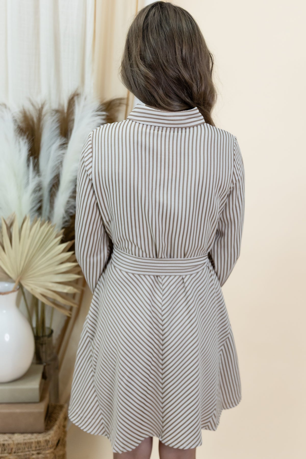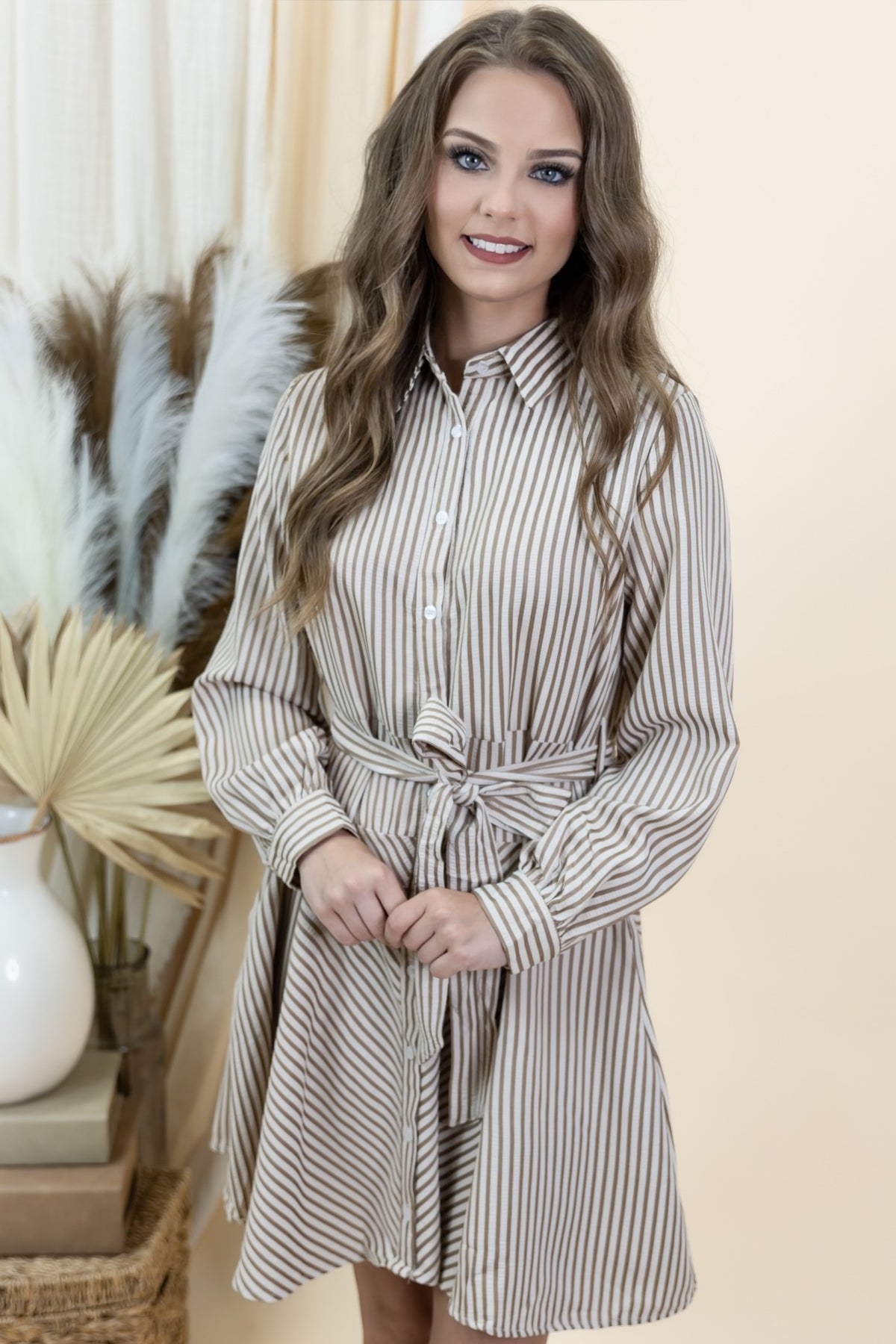 Step into effortless style with "The Better Way" Dress in timeless taupe. This playful striped mini dress features long sleeves and a classic button-down front, pairing comfort with chic flair. Functional pockets add a dash of practicality, perfect for your essentials on the go. Whether dressed up or down, it’s your new go-to for a fresh, fun look.