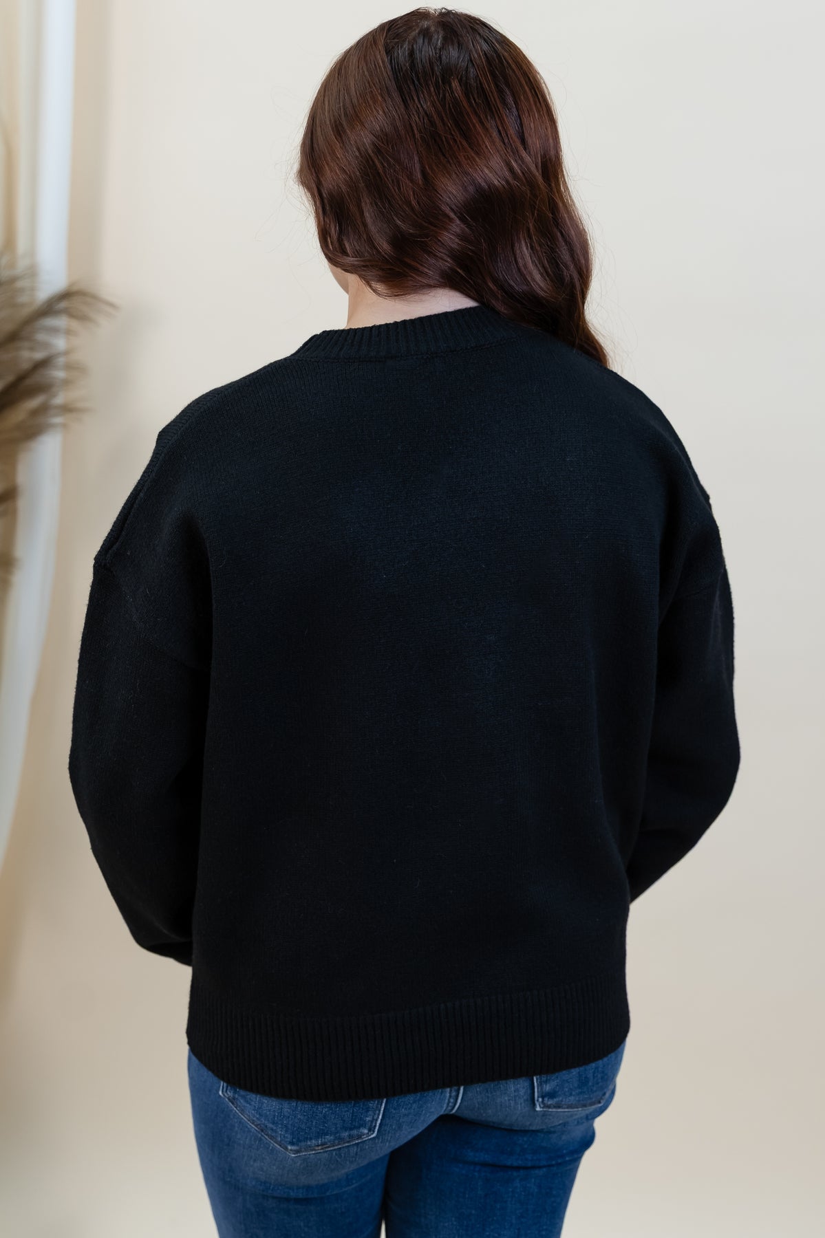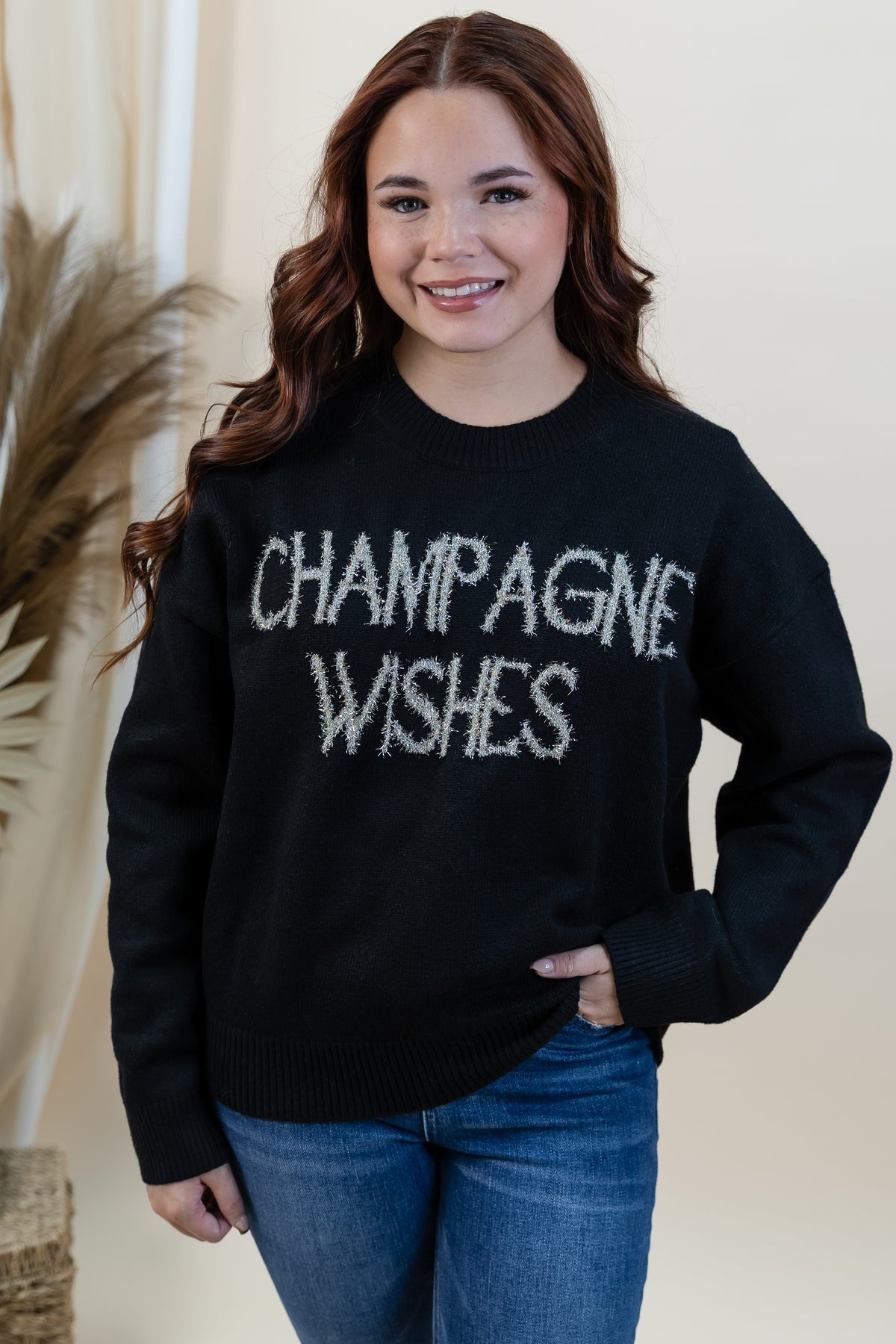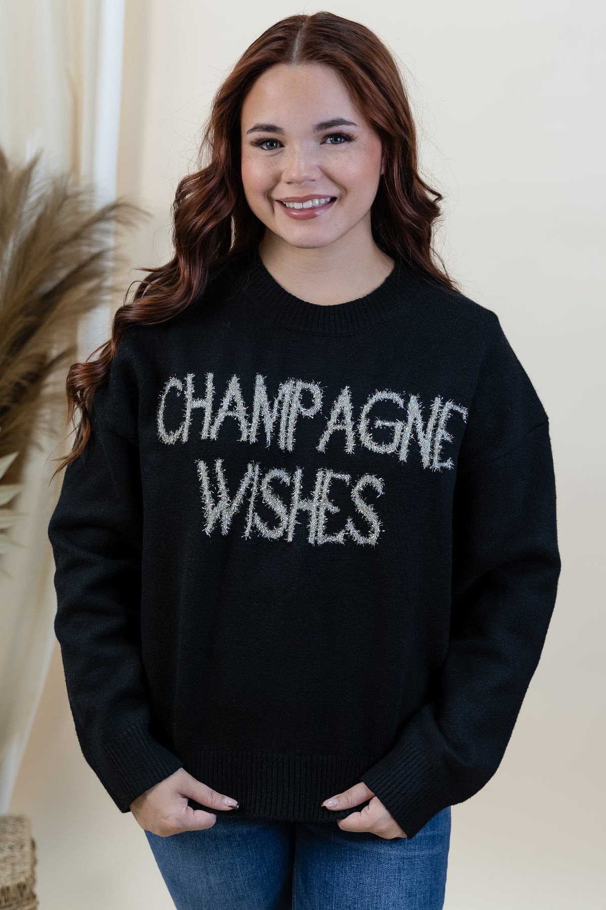 Celebrate every cozy moment with the "Champagne Wishes" Sweater! This black round-neck top brings a splash of fun and comfort to your wardrobe, perfect for lounging or sparkling at casual outings. Get ready to feel fabulous and festive all day long!