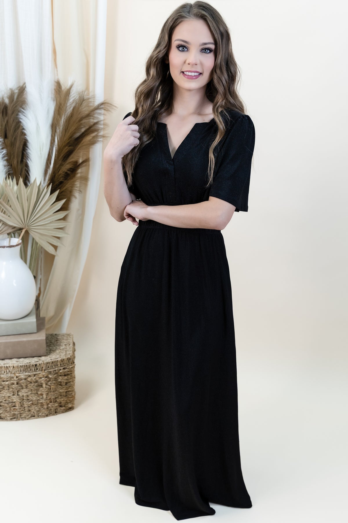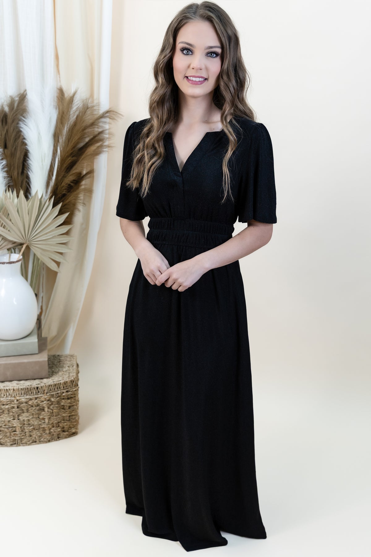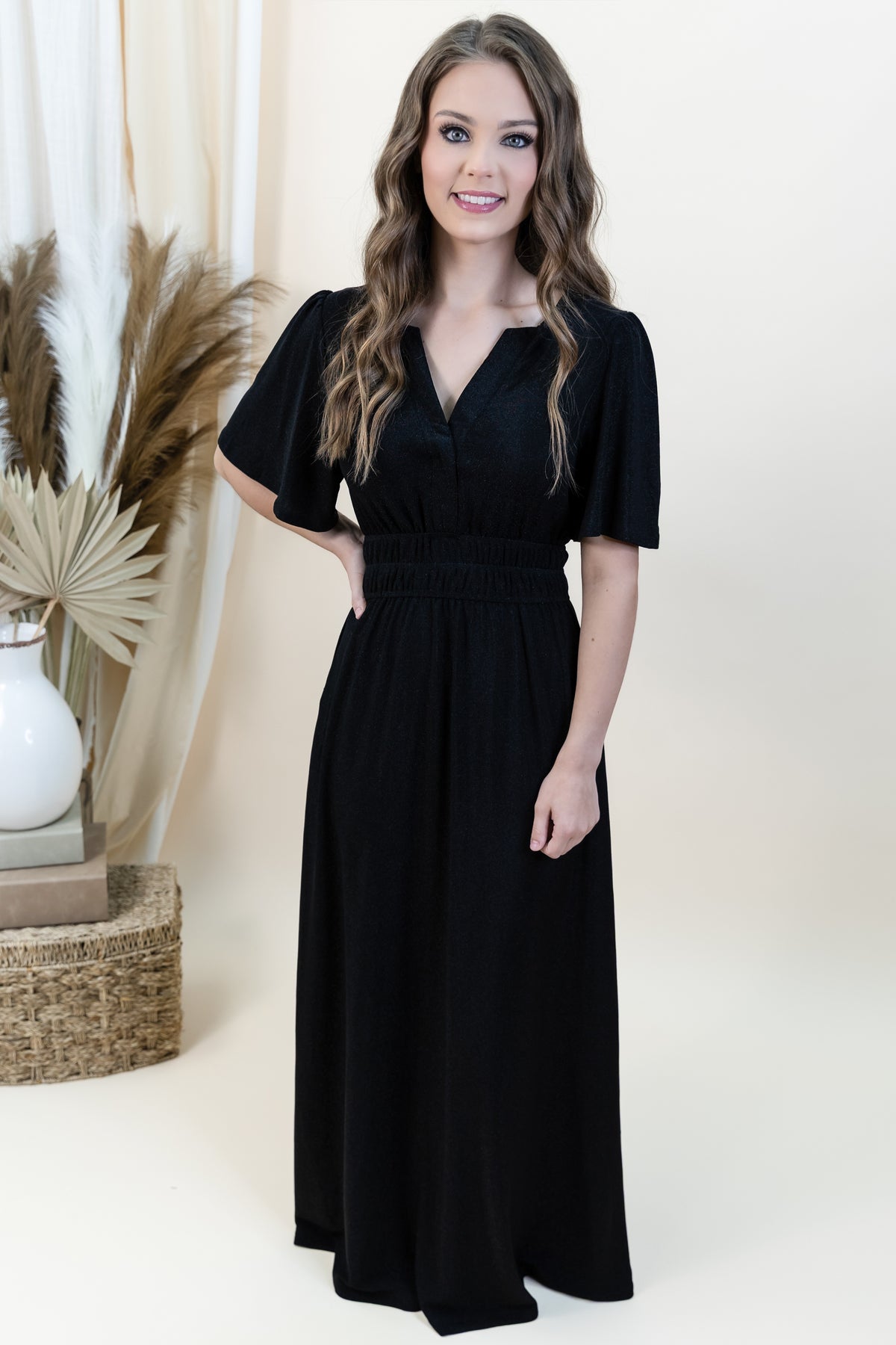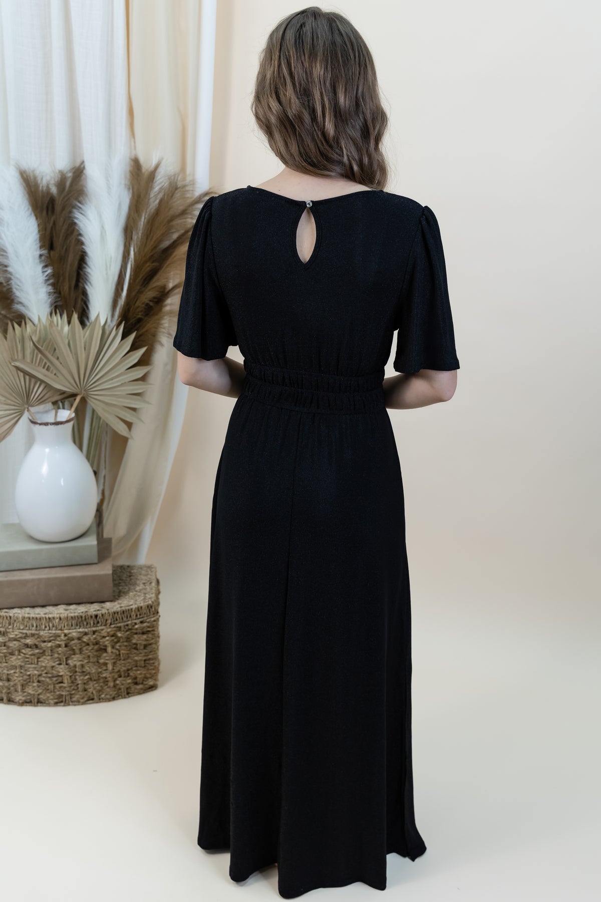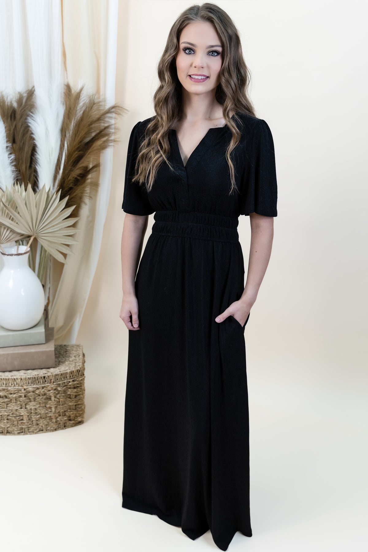 Turn heads in the "Electric Aura" Dress, a black metallic lurex knit maxi that shimmers with every move. Its playful bell sleeves add flair, while the elastic waistband ensures a comfy, flattering fit. Plus, handy pockets keep your essentials close, making this dress as functional as it is fabulous. Perfect for dancing the night away or lighting up any occasion!