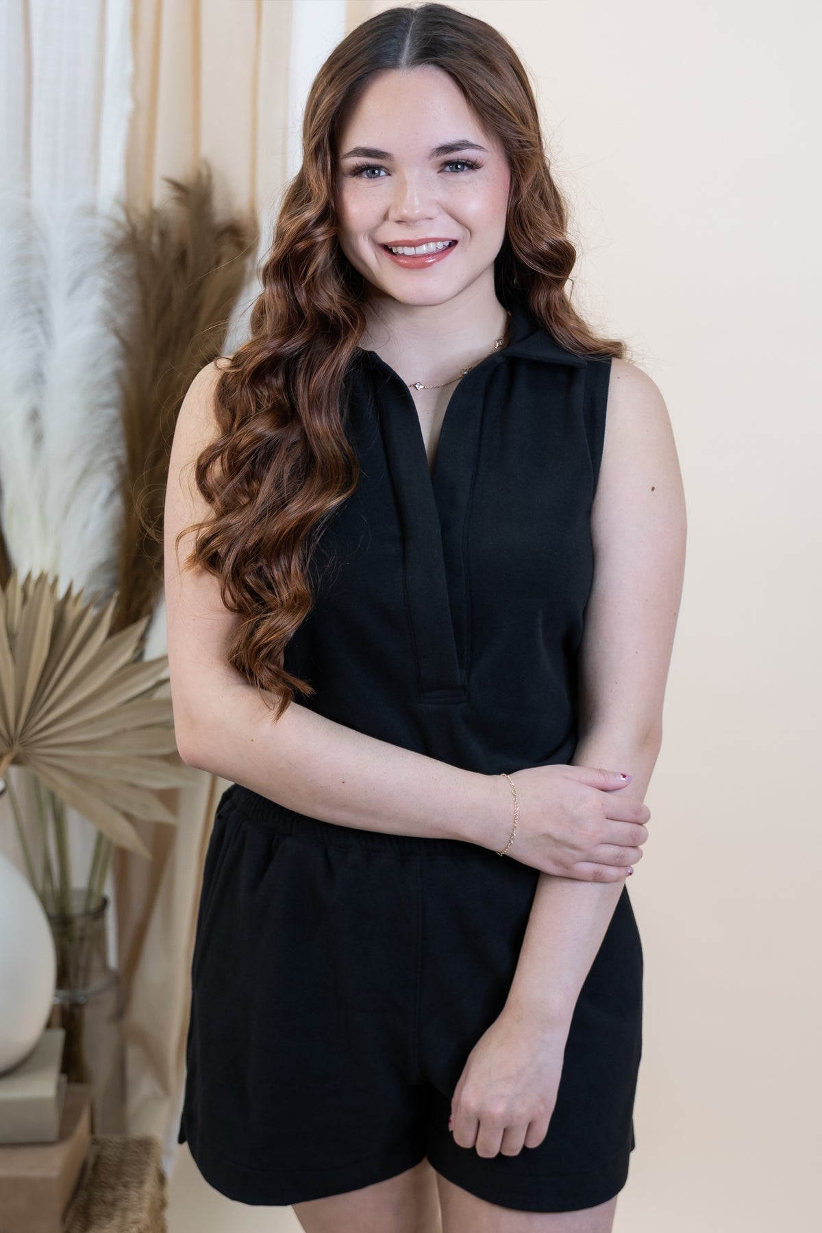 The "Get Up & Go" romper in black combines sporty charm with playful ease. Its athletic collar and hidden buttons keep things sleek, while the elastic waist ensures a comfy, flattering fit. With handy side pockets and breezy side slits, this romper is ready for whatever your day throws at you—stylishly and effortlessly.