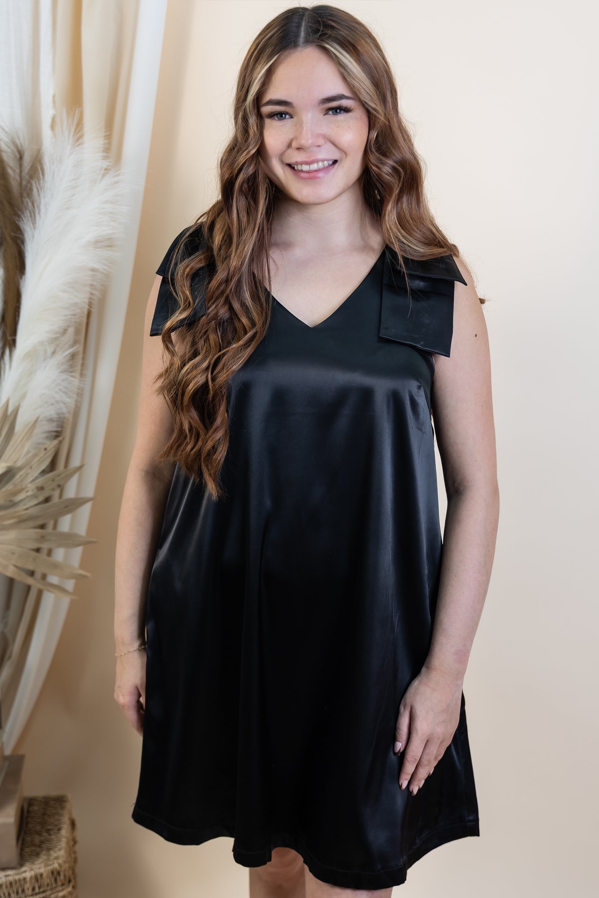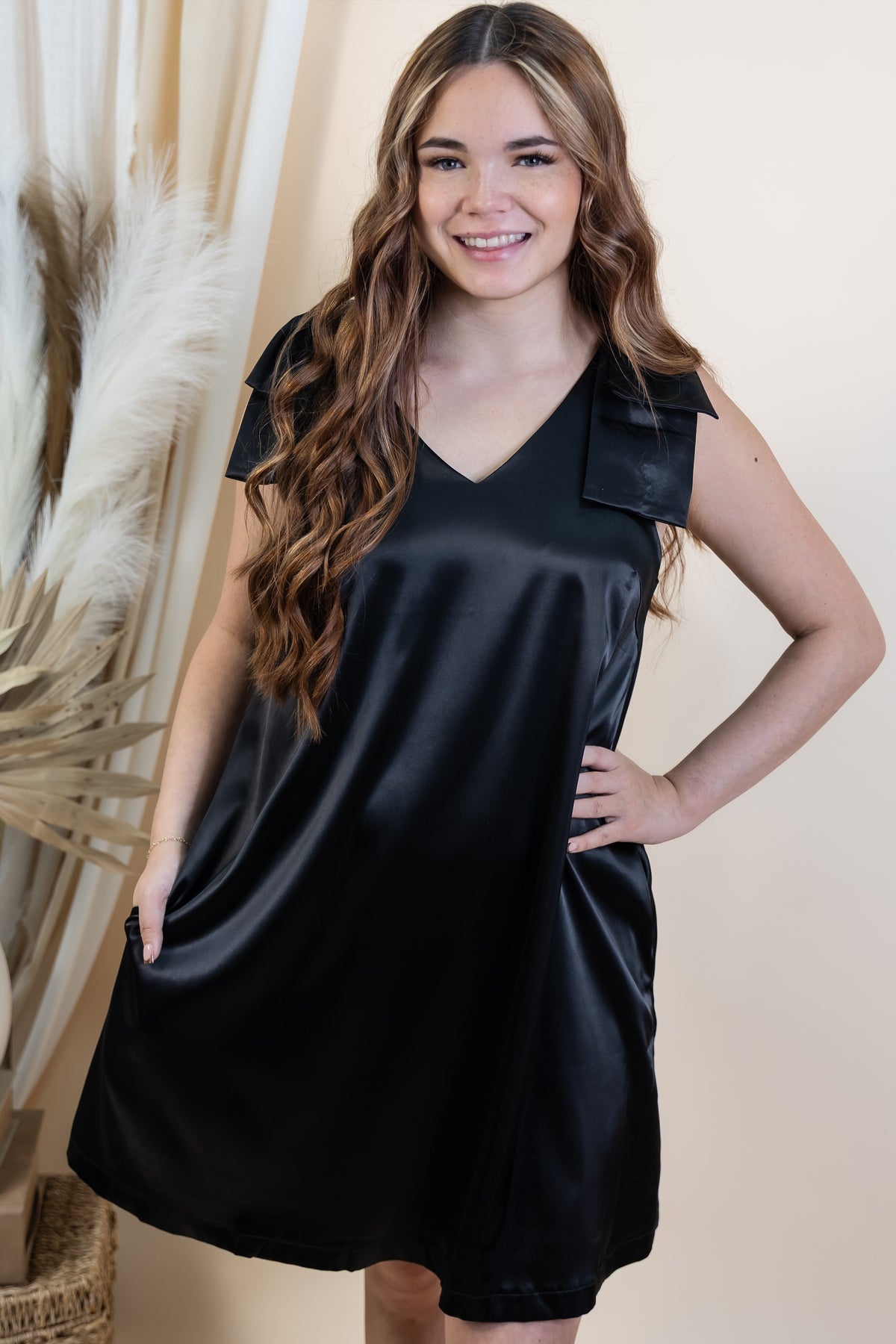 The "Graceful Ties" Dress in black is a fun and flirty sleeveless mini with charming bow accents on the shoulders and a chic V-neckline. Lightweight and fully lined, this woven dress stays comfy and non-sheer, while handy side pockets keep your essentials close. Perfect for twirling through any day or night with playful elegance!