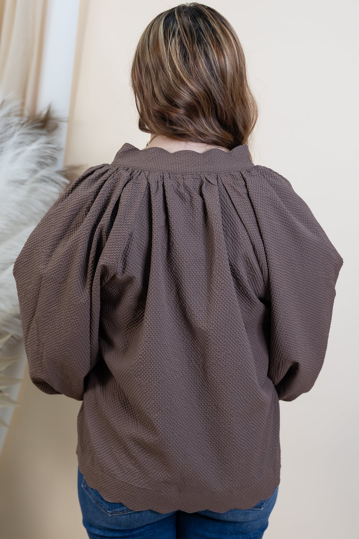 The "It Always Works" Blouse in chocolate brings playful charm with its textured fabric and flirty V-neckline. Enjoy the airy feel of 3/4 balloon sleeves and a relaxed, flowy fit that moves with you. Finished with a scalloped hemline and a lightweight, unlined design, this blouse is your go-to for effortless, fun style.