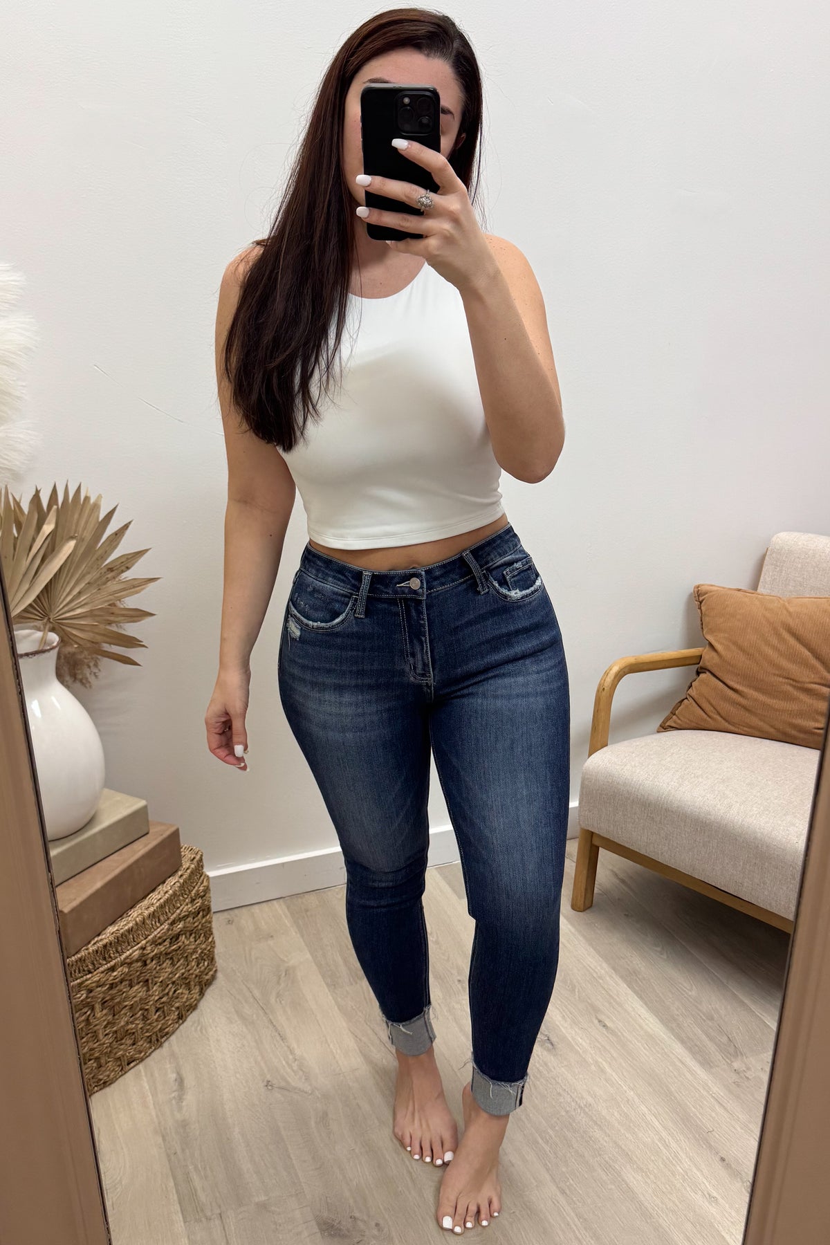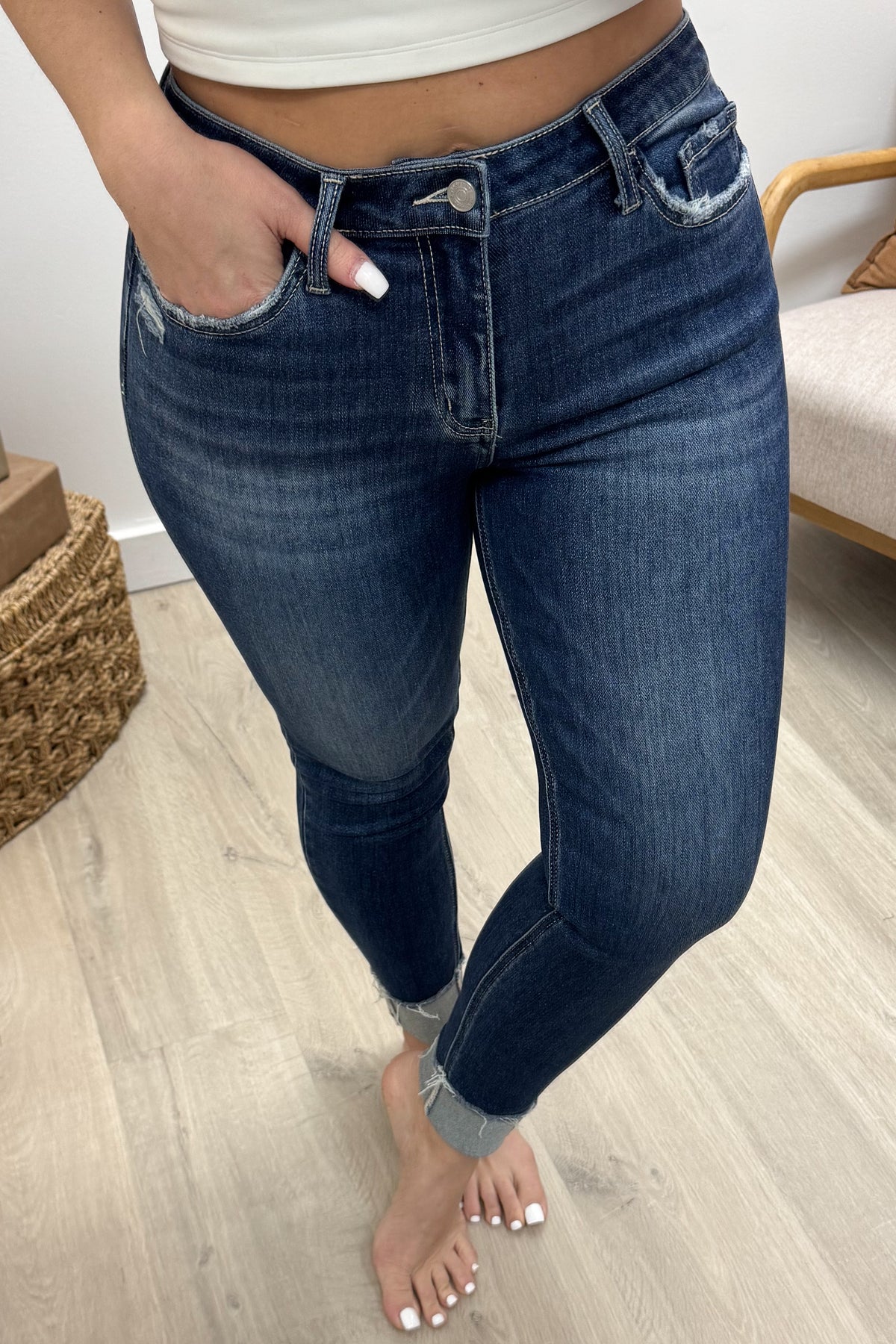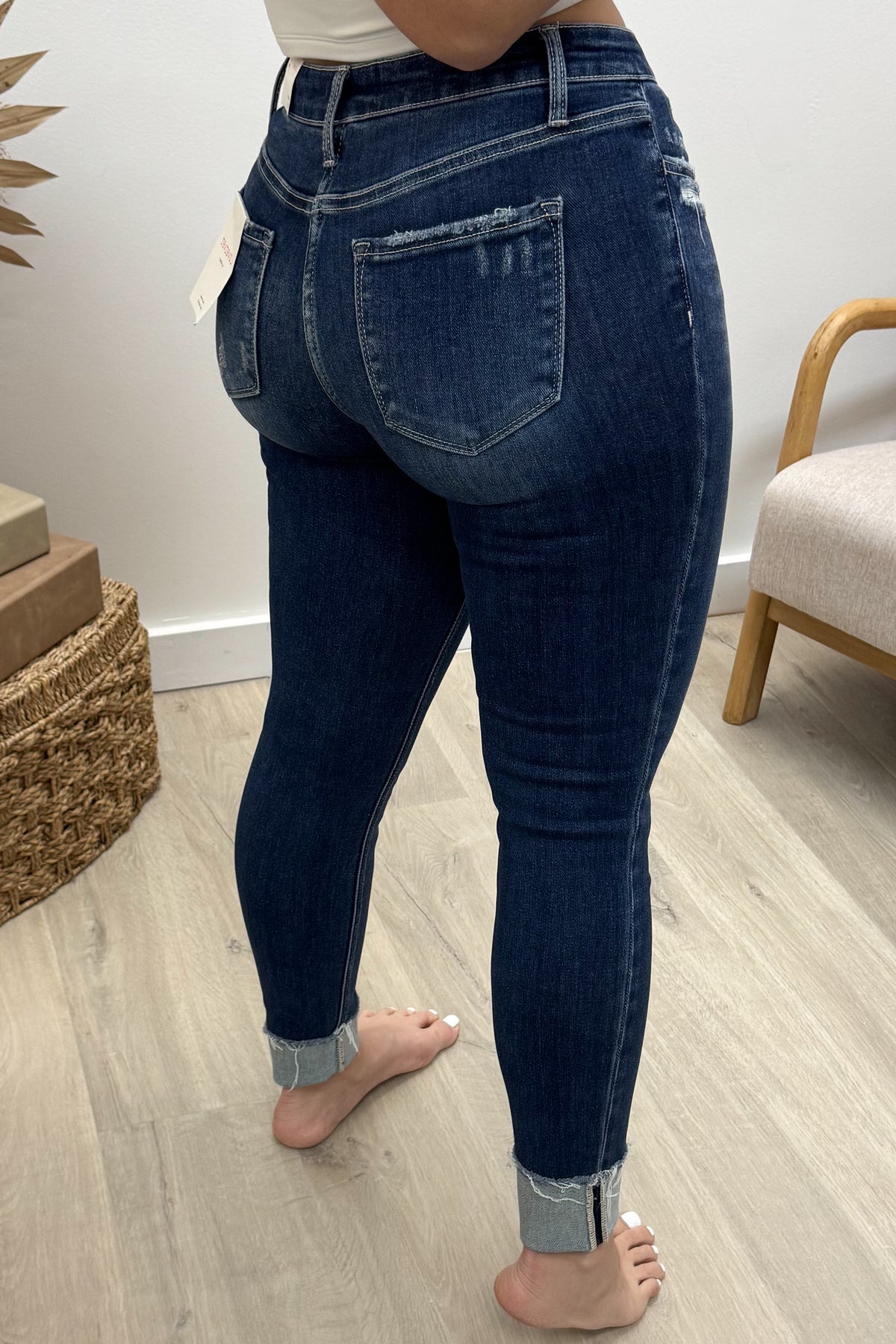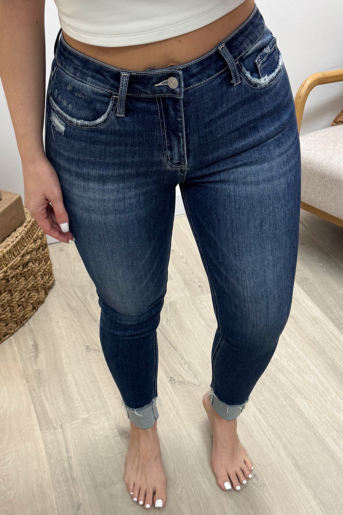 Slip into the Juliette Skinny Jeans for a perfect blend of comfort and style. Crafted from stretch denim, these mid-rise jeans hug your curves while offering all-day ease. The slightly distressed details add a touch of edge, and the single cuff hem at ankle length keeps things fun and flirty. Whether you're dressing up or down, these skinny jeans bring a playful vibe to any outfit.