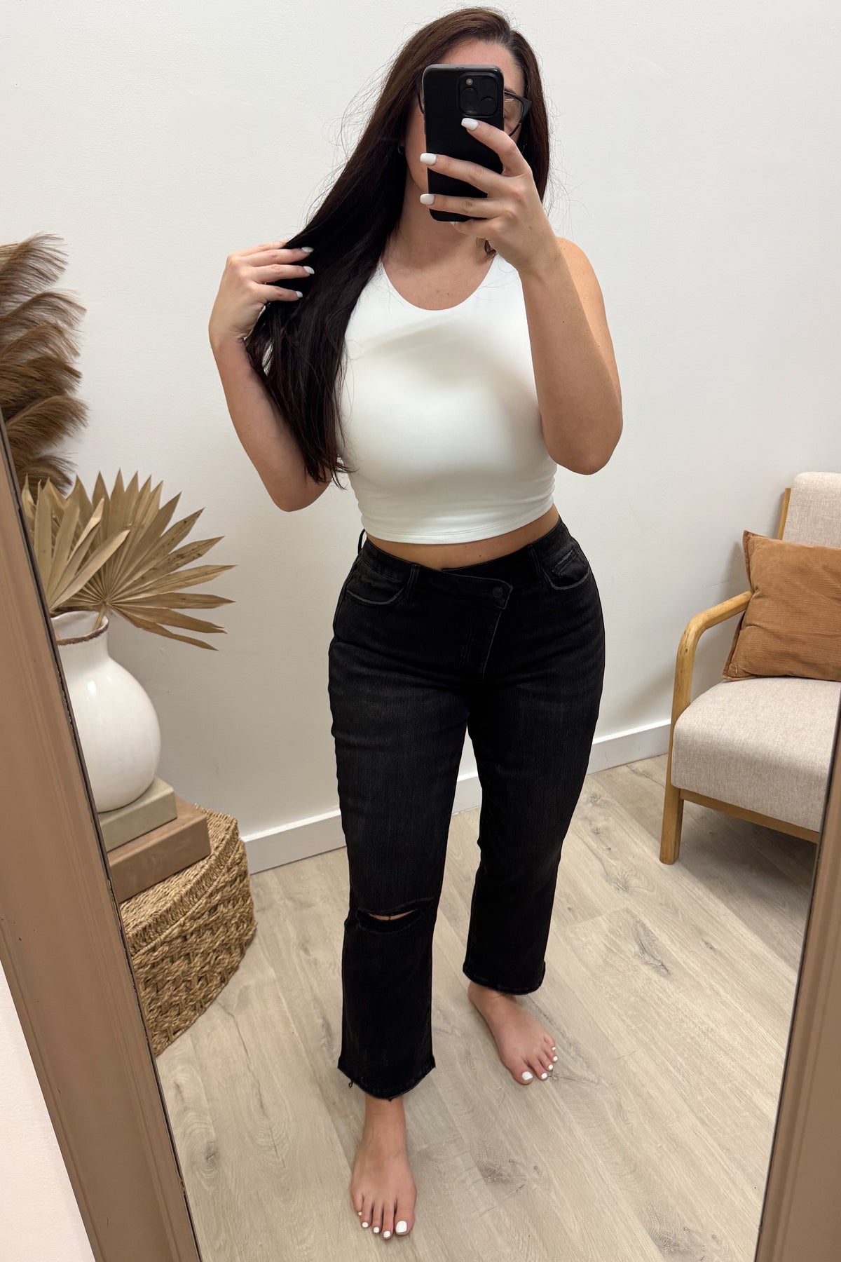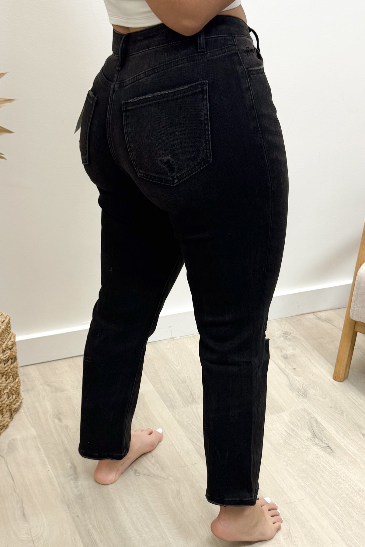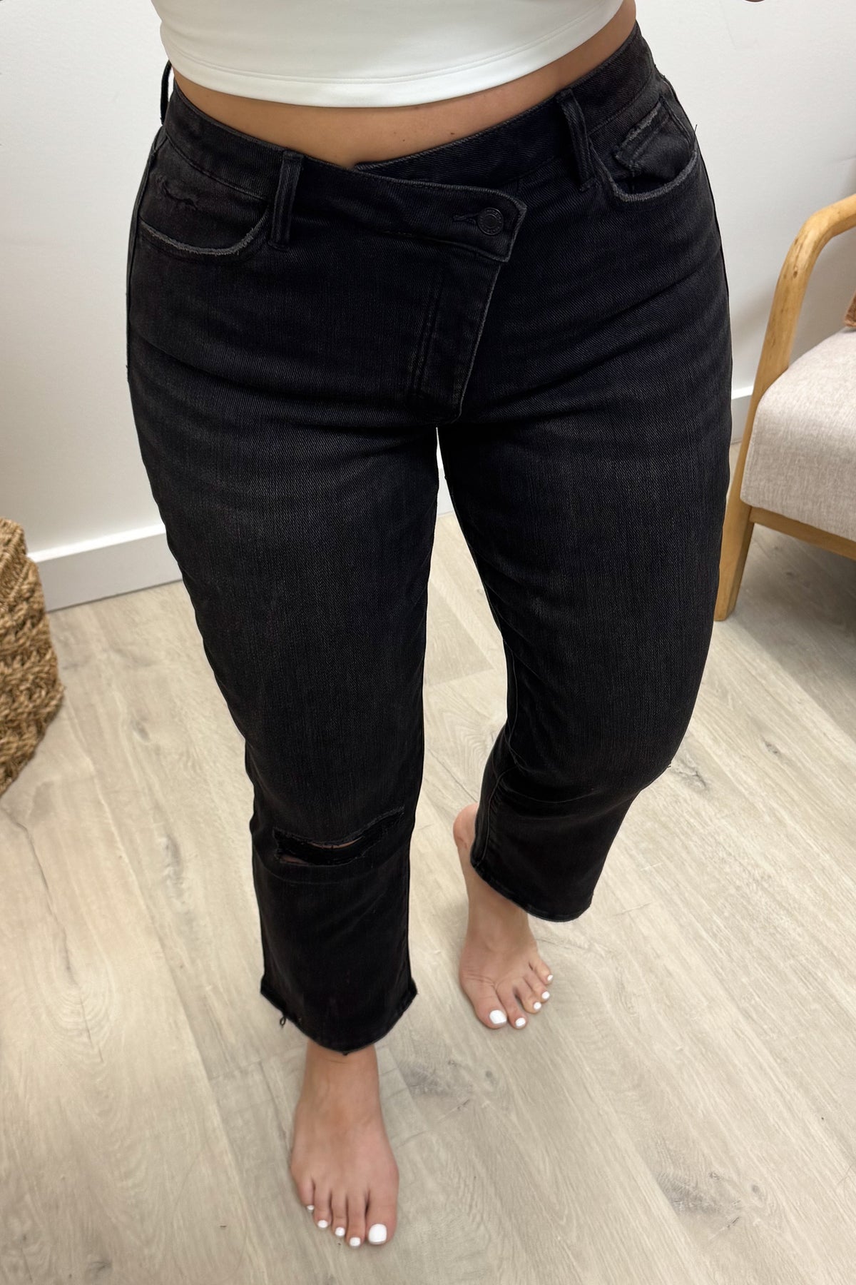 Step out in style with the Melanie Straight Leg Jeans! These black, distressed denim beauties feature a flattering crossover waistband, high-rise fit, and comfortable stretch fabric that moves with you. The straight-leg cut creates a sleek silhouette, while the ankle-length hem adds a trendy touch, perfect for showing off your favorite shoes. Mix comfort and edge effortlessly for everyday wear!