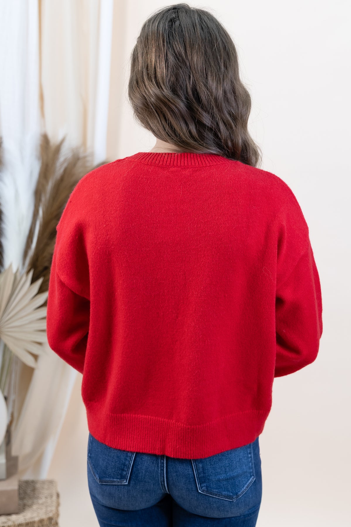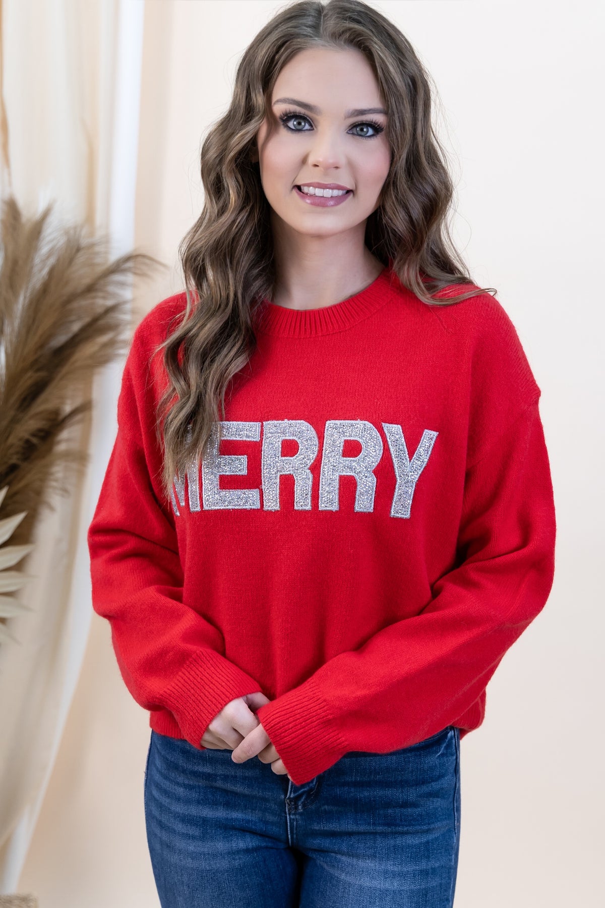 Celebrate the season with the "Merry Magic" Sweater in festive red and silver! This relaxed crop design offers a fun, comfy fit perfect for holiday gatherings or cozy nights in. Sparkling silver accents add a touch of glittering cheer to your outfit, making every moment merry and bright. Embrace casual holiday style with playful comfort!