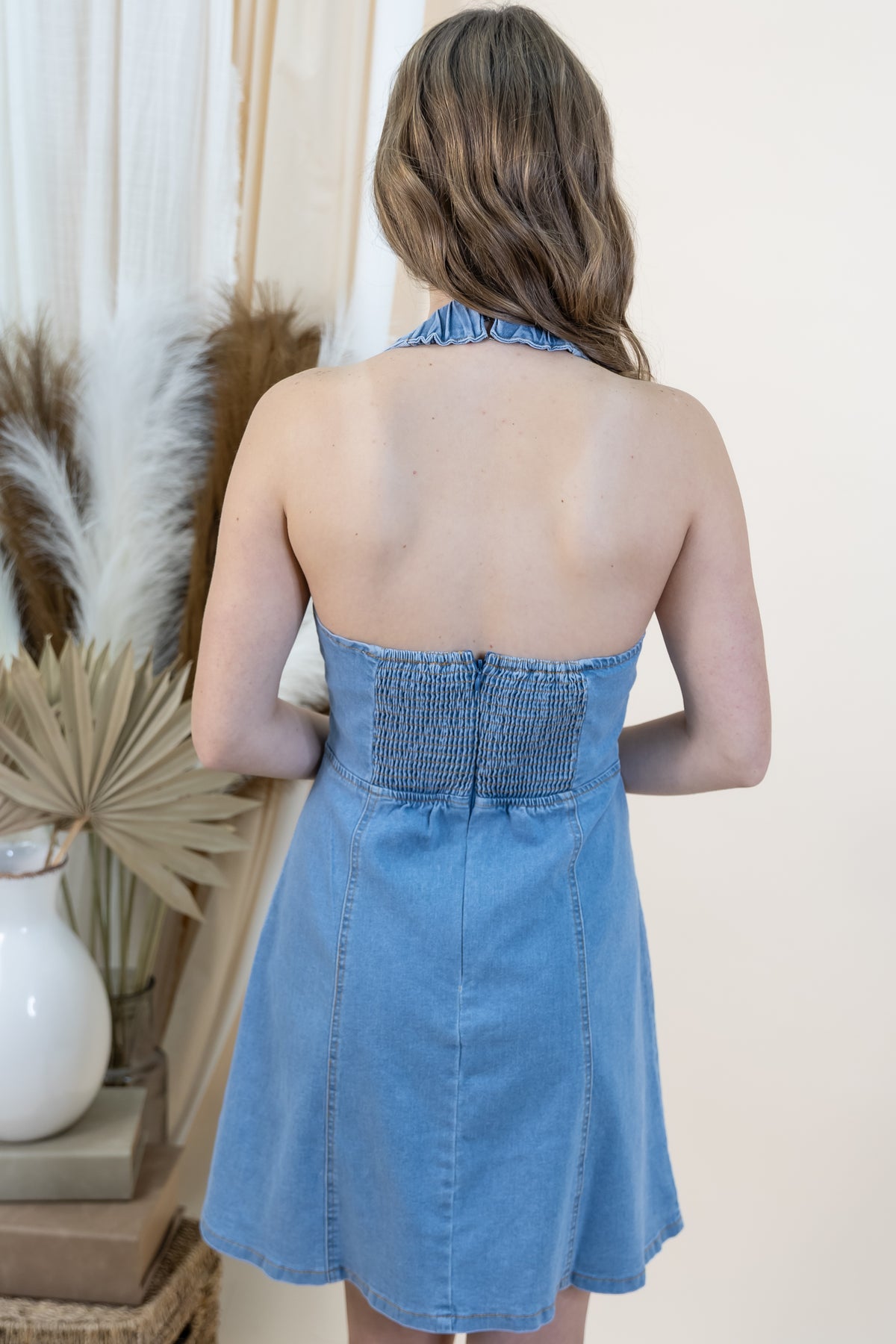 Turn heads at the rodeo or anywhere else in this flirty halter neck denim mini dress. The light wash denim gives off effortless Western vibes, while the playful halter neckline keeps things fun and flirty. Perfect for summer adventures, festival season, or whenever you're ready to channel your inner rebel. Pair with boots and attitude for the ultimate statement look.