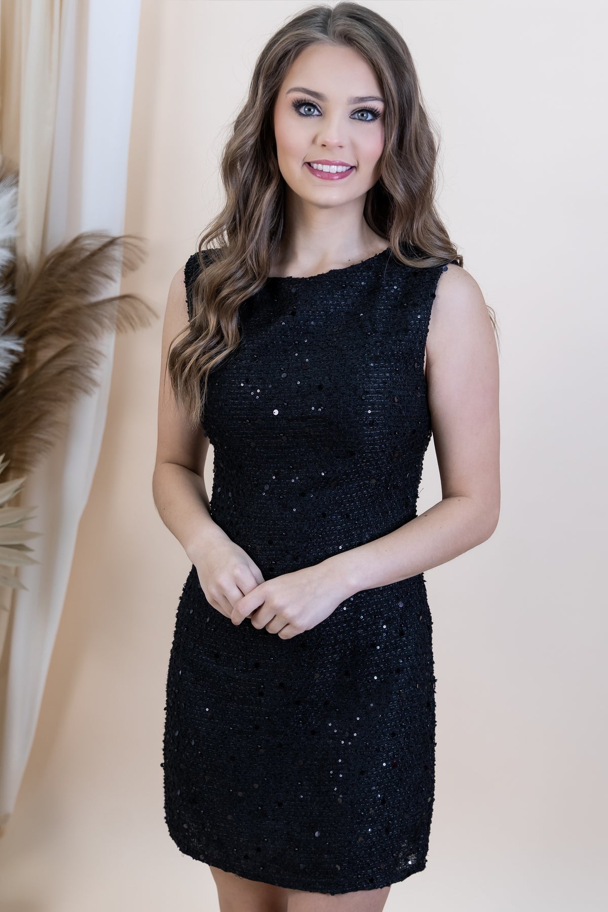 Step into the spotlight with the "Twinkling Tweed" Dress. This sleeveless black dress dazzles with shimmering sequins woven into classic tweed, combining timeless charm with a fun, sparkling twist. It's the perfect playful piece to brighten up any party or night out.