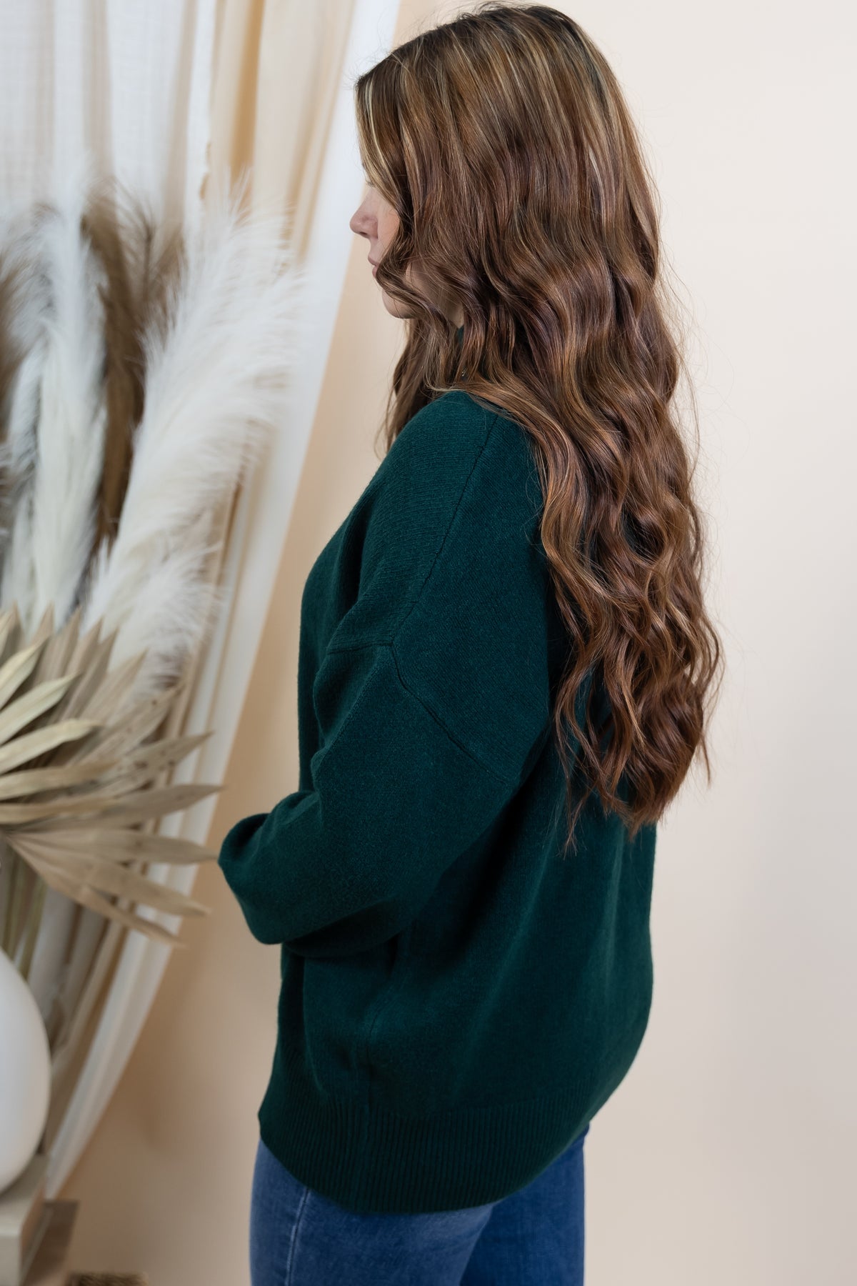 Cozy up in the "Warm Embraces" Sweater—your new favorite knit companion! With a playful mock neckline and relaxed drop shoulder design, it offers effortless comfort and style. The front seam detail adds a cheeky twist, while ribbed knit trim keeps things snug. Perfect for layering or wearing solo, this long-sleeve pullover delivers warmth without the fuss of lining. Embrace every chilly day in hunter green and all the cozy vibes!