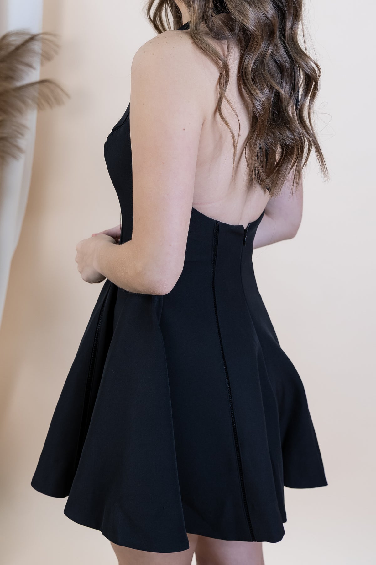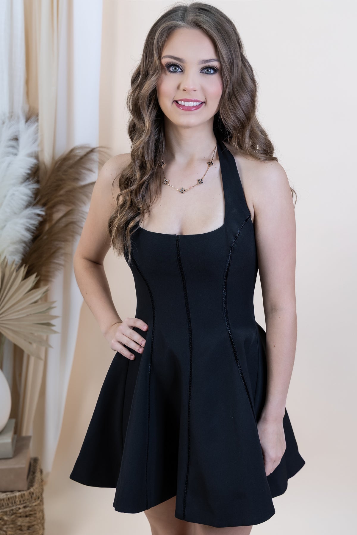 Flirty and fun, this black skater mini dress brings the perfect balance of sass and sophistication. The halter neck creates a flattering silhouette while delicate lace trim adds an unexpected touch of elegance to the neckline and hem. Perfect for date night, girls' night out, or whenever you want to feel confident and fabulous. Pair it with heels and your favorite accessories for an instant showstopper look that says you've got style for days.