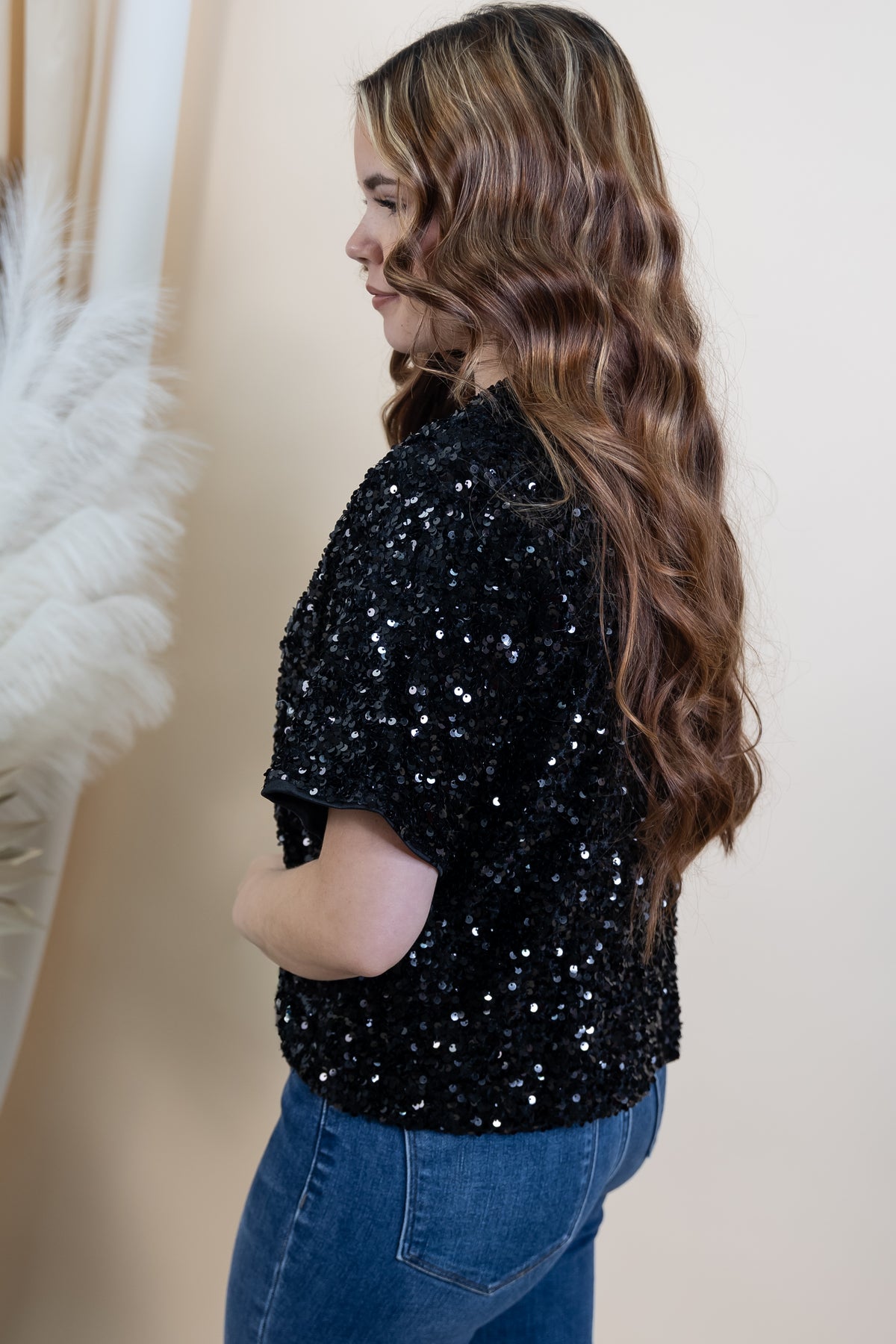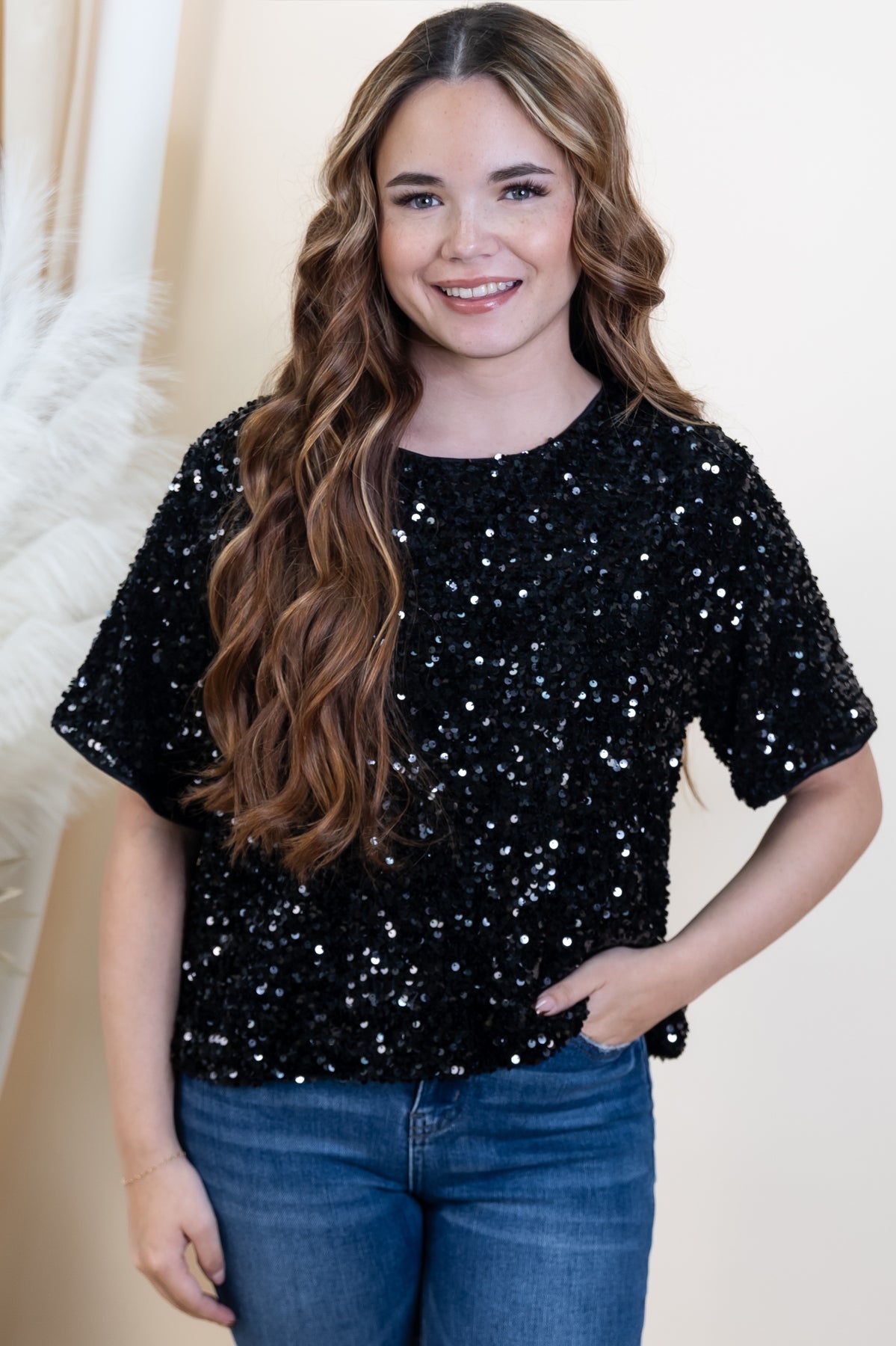 Slip into the spotlight with our "Midnight Glow" Top! This black short-sleeve sequin beauty catches the light with every move, making you the star of any gathering. Perfect for date nights, parties, or whenever you want to add a little sparkle to your everyday style. The comfortable fit means you can shine all night long without sacrificing ease. Get ready to turn heads!