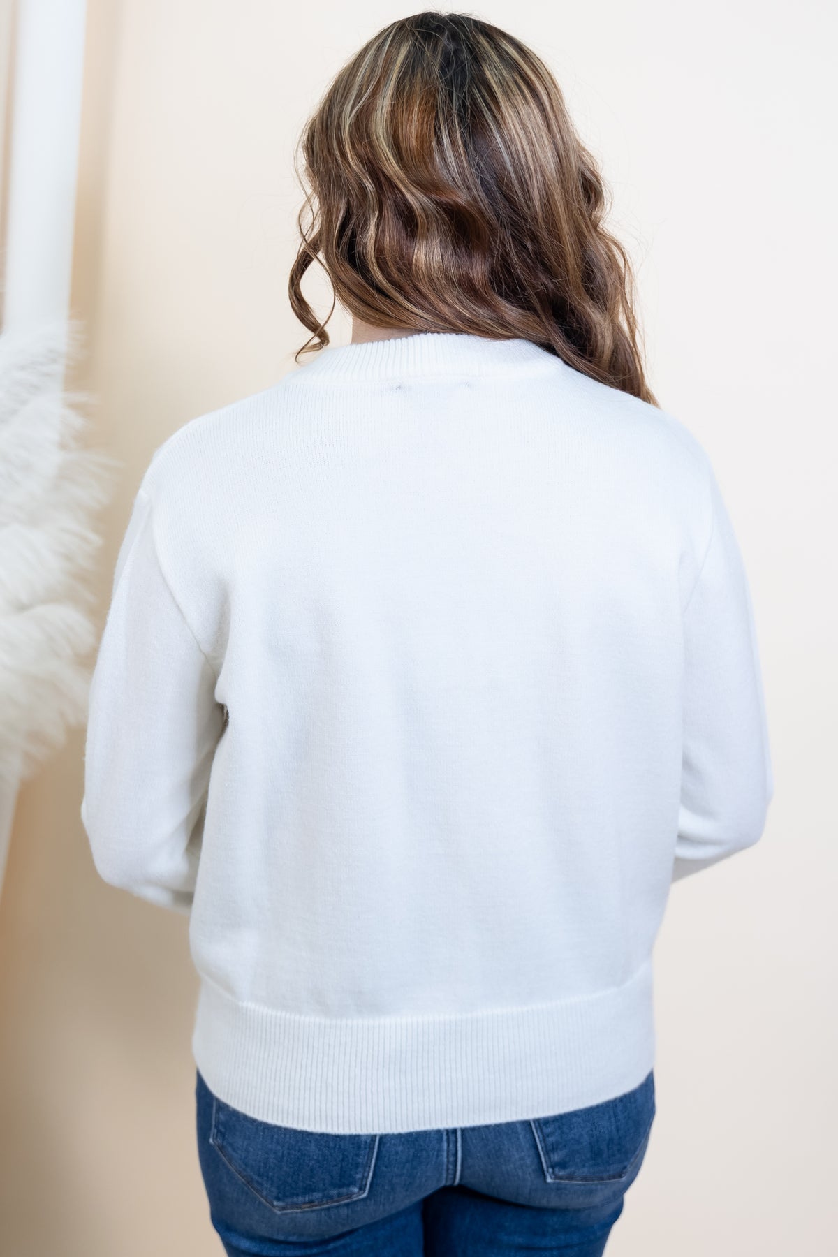 Show off your glamorous side with our "Ribbons Of Glamour" sweater. This off white sweater features oversized sequin ribbons that add a touch of sparkle and fun to your look. The drop shoulder and ribbed edge give it a relaxed and comfortable fit, perfect for any occasion. Stay cozy and stylish with this unique sweater top.