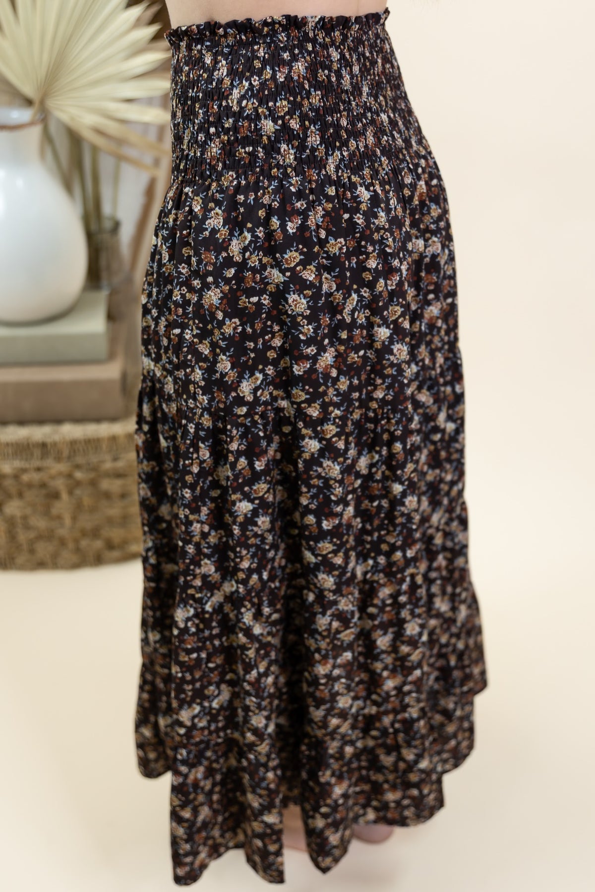 The "Invite Only" Skirt in Espresso Combo brings playful elegance with its floral tiered layers and a flirty front slit. Designed with a smocked waist, it offers a comfortable, flexible fit that moves with you. Perfect for adding a touch of fun and flair to any outfit!