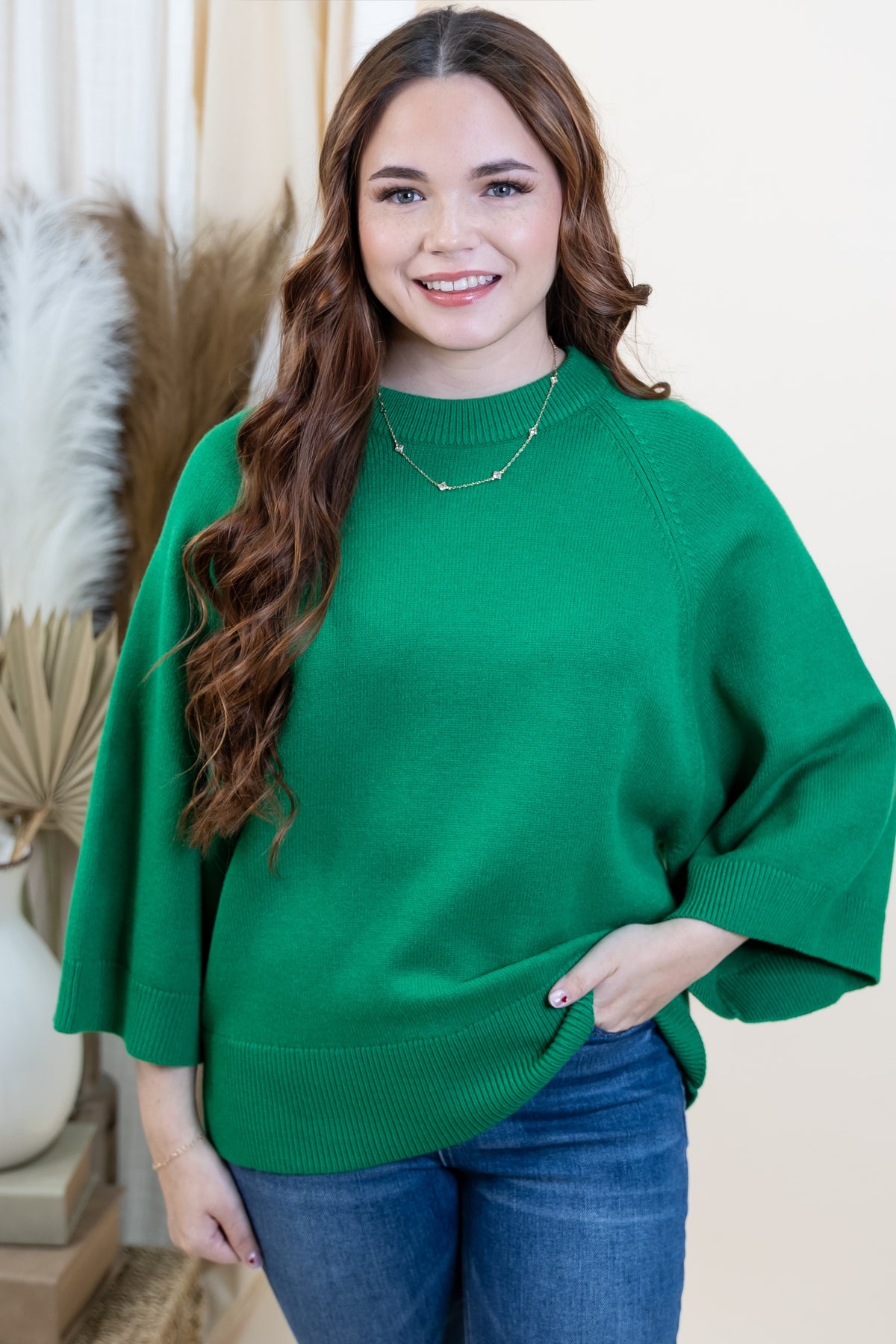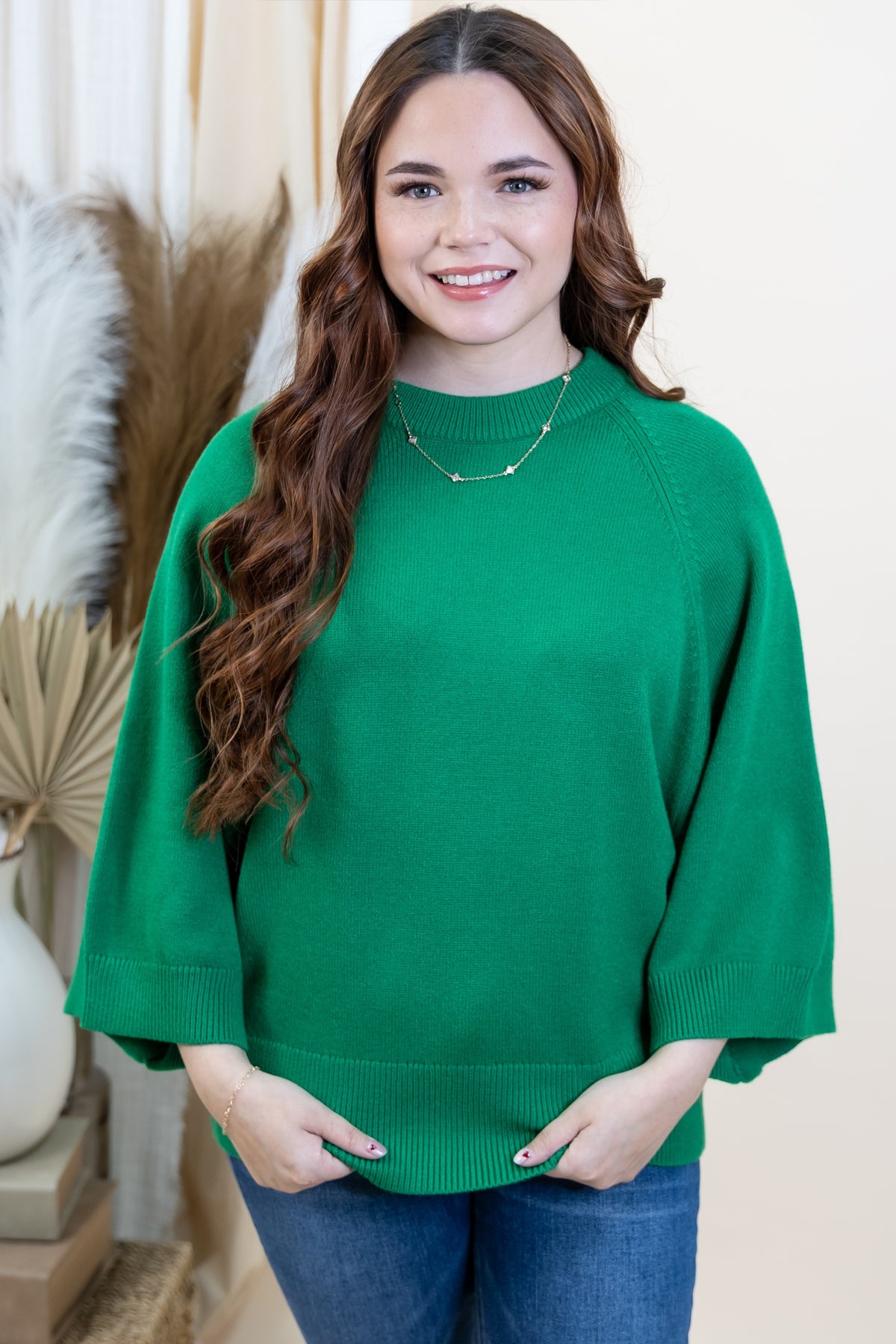 Effortlessly chic and undeniably cozy, this "Laid-Back Luxe" sweater is your new go-to for relaxed vibes. The drop shoulder silhouette creates an easy, slouchy fit that feels like a warm hug, while generously wide sleeves add that coveted laid-back appeal. Crafted from soft, breathable fabric, it's perfect for lounging, running errands, or looking put-together without trying. Available in a gorgeous kelly green that pairs with everything in your closet.