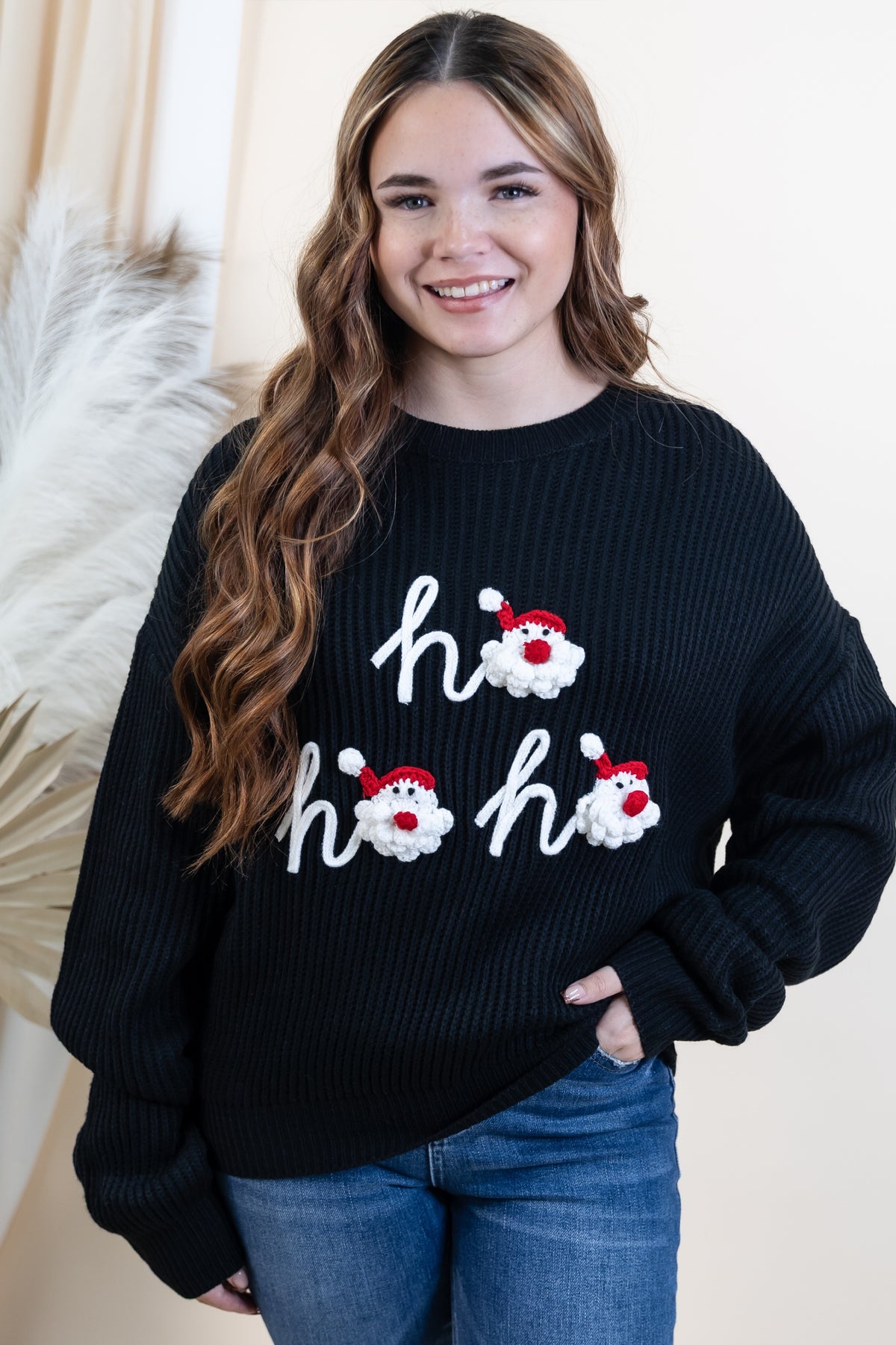 Bring festive fun to your wardrobe with the "Ho Ho Hooked" Sweater in black. This playful long-sleeve sweater features a charming 3D crochet Santa design that adds texture and holiday cheer. Cozy and eye-catching, it’s perfect for spreading smiles at holiday parties or casual winter days. Stay warm and spirited with a sweater that hooks everyone’s attention!