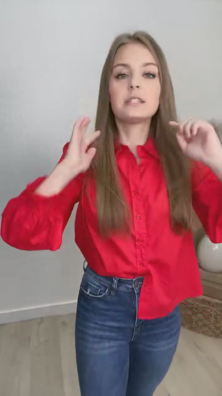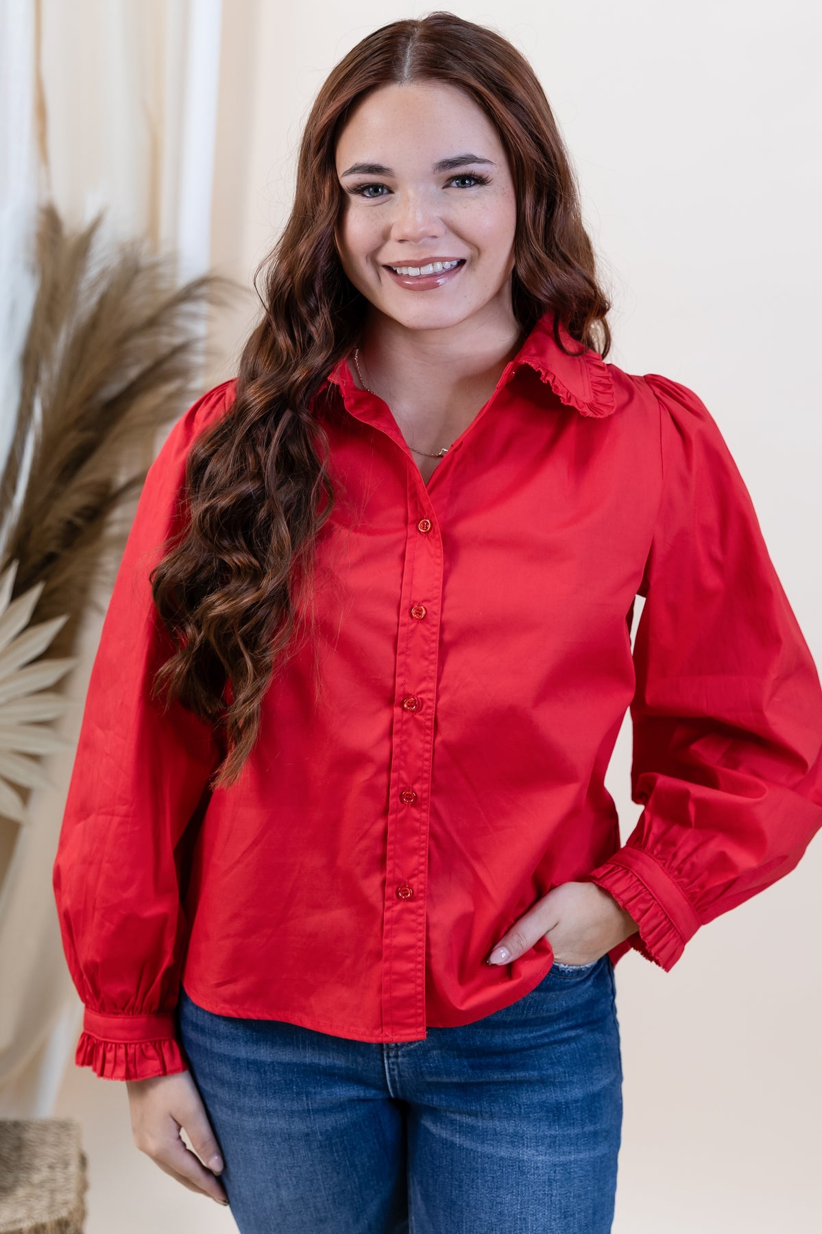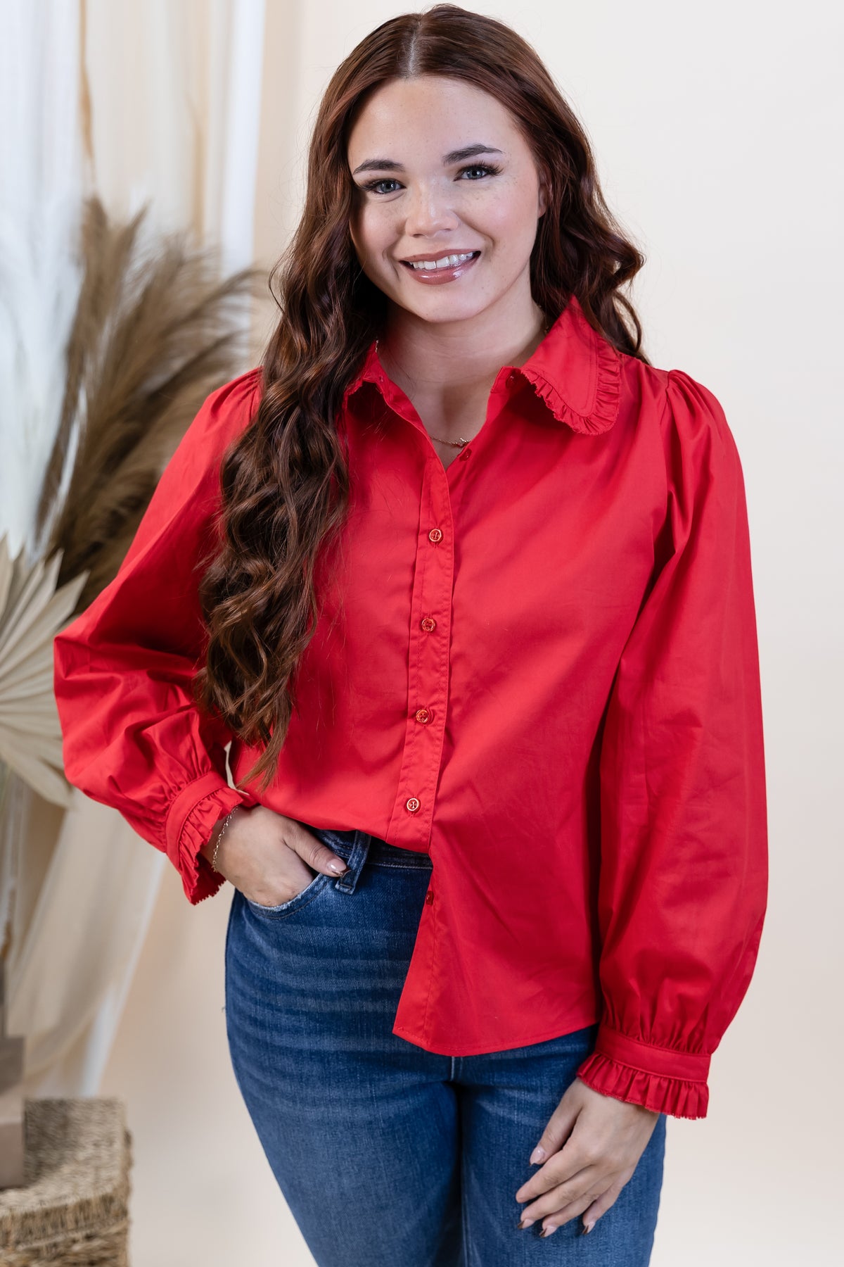 Elevate your holiday wardrobe with this charming red blouse featuring delicate ruffle-trimmed long sleeves and a ruffled collar that adds instant sophistication. The classic button-down design pairs effortlessly with everything from tailored trousers to your favorite jeans, making it perfect for festive gatherings or everyday elegance. Playful details meet polished style in this versatile piece that's sure to become a seasonal favorite.