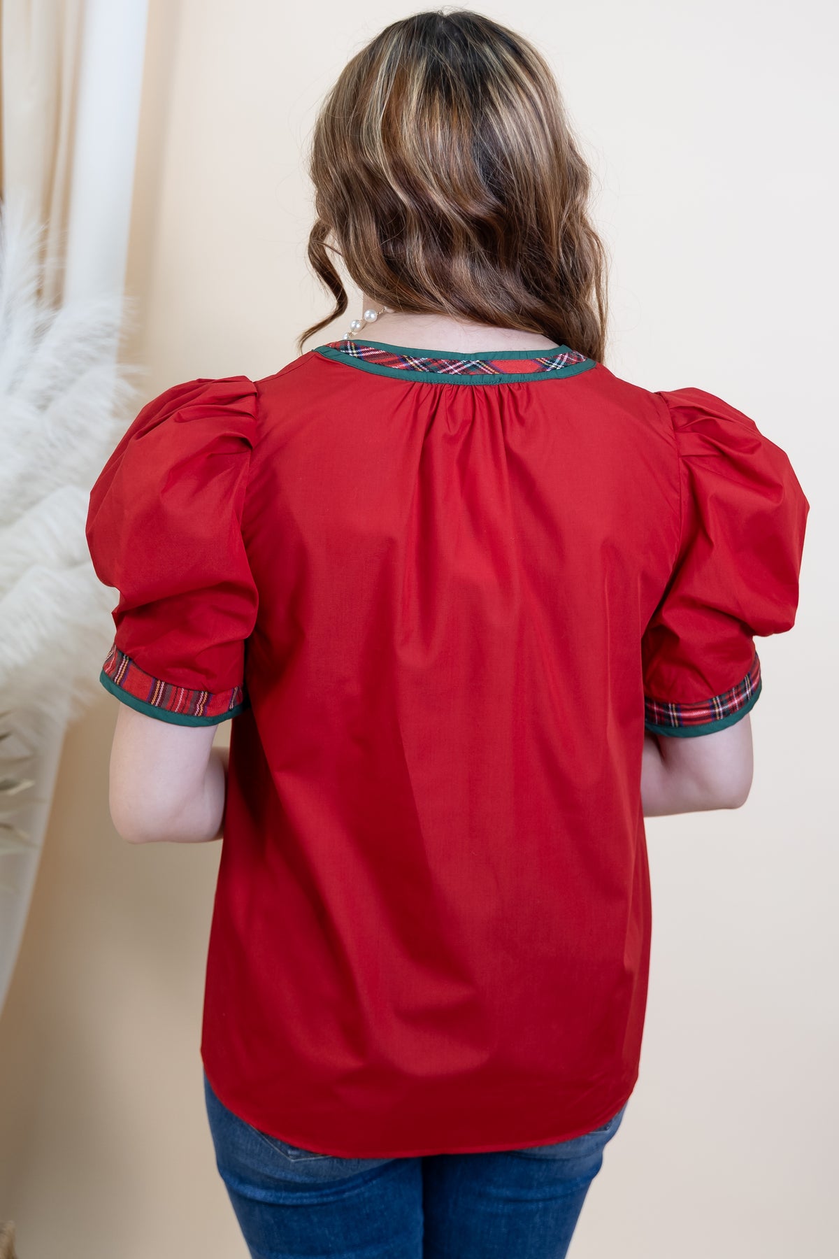 Add some festive flair with the "Under The Mistletoe" blouse in vibrant red. This lightweight, woven top features playful short pleated puff sleeves and a contrasting V-neck band that adds a charming twist. Unlined and non-sheer, it’s perfect for layering without extra bulk. Embrace holiday cheer with a flirty, fun look that’s as bright as the season!