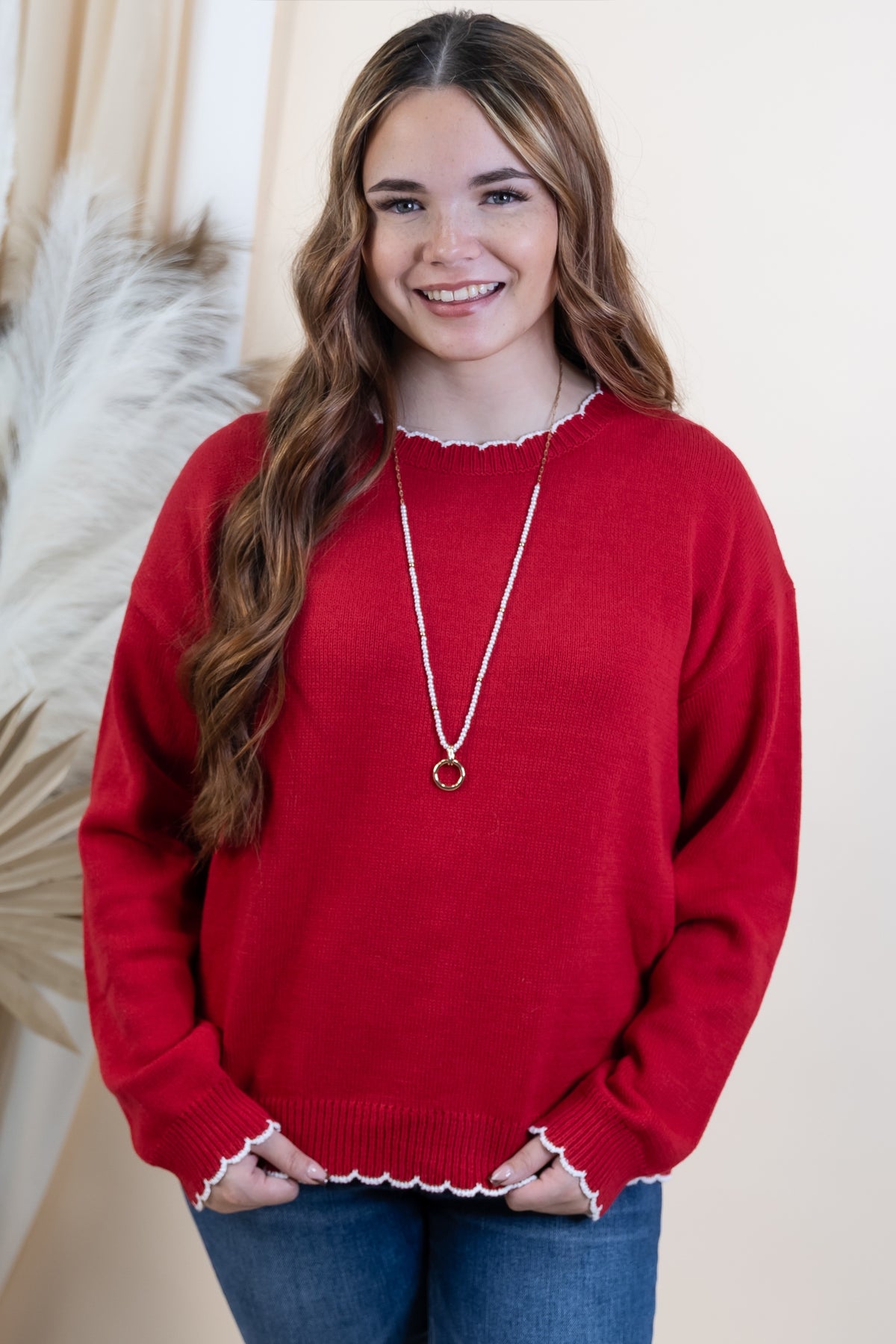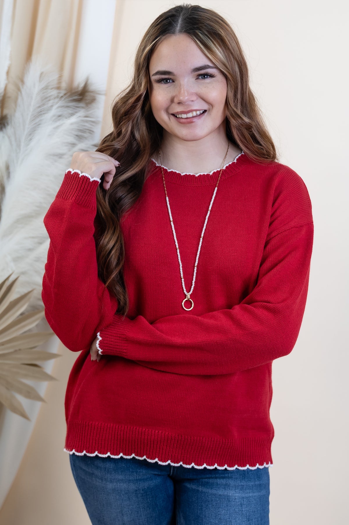 Step out in style with the "A Few Steps Ahead" Sweater in vibrant red and crisp white. Featuring a charming scalloped edge, this cozy sweater adds a playful twist to your everyday look. Perfect for layering or wearing on its own, it keeps you comfortably ahead in both fashion and warmth.