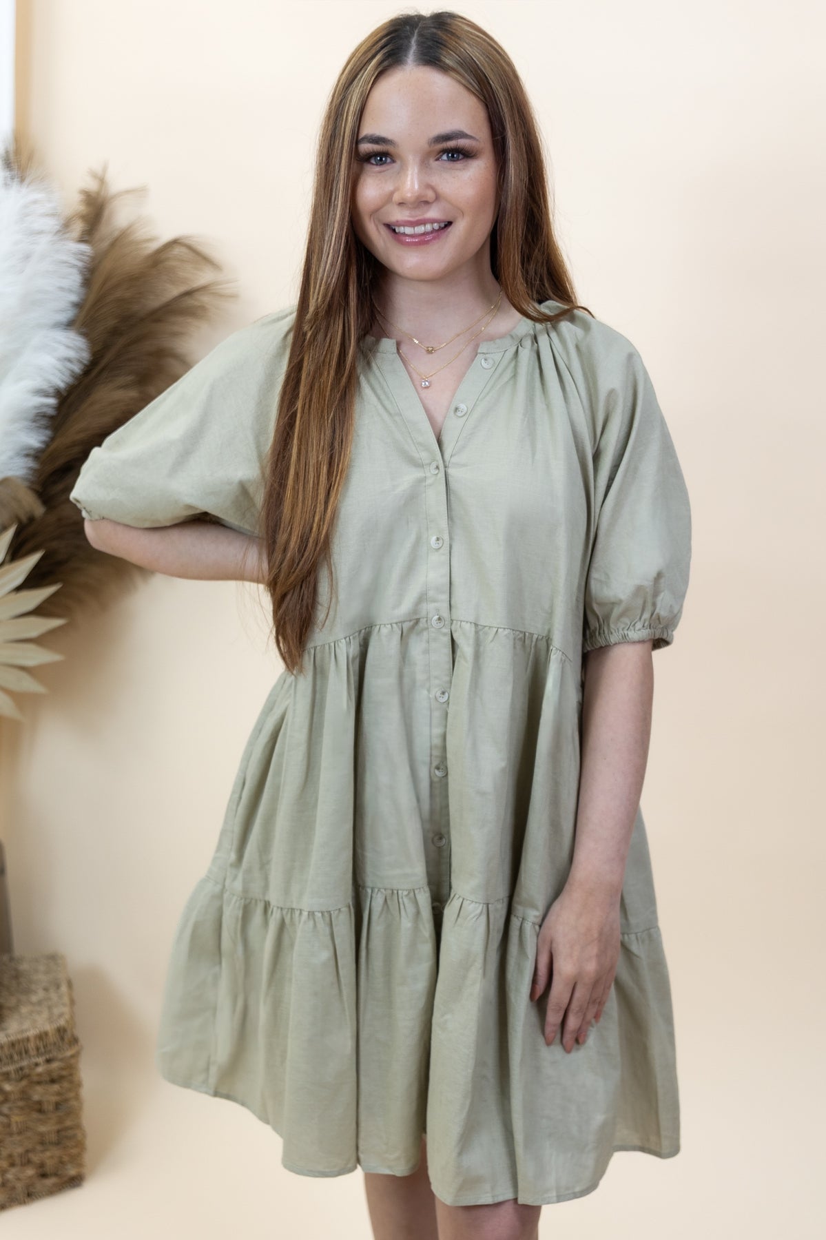 Embrace effortless style with the "My Free Time" Dress in Grey Olive. This linen tiered mini dress features functional buttons for easy wear, side pockets to keep your essentials close, and a comfortable lining for a smooth feel. Perfect for playful days and relaxed outings, it combines comfort and charm in one easy piece.