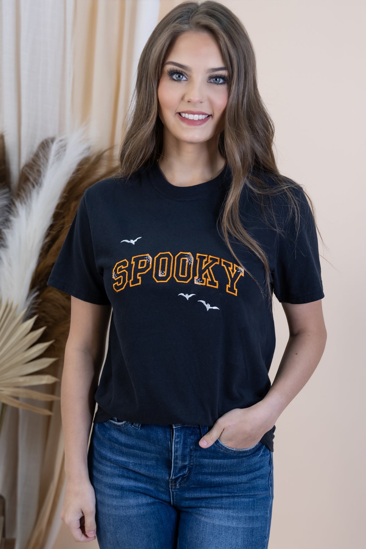 Celebrate the spooky season with our playful "Spooky" T-Shirt in black! This comfortable tee features vibrant orange embroidery spelling out "Spooky," decorated with whimsical white cobwebs and bats for a fun, festive look. Perfect for adding a touch of Halloween charm to any outfit.