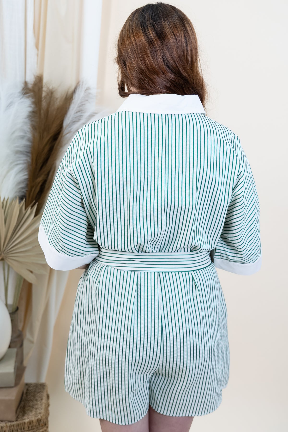 Stripes never go out of style, and this romper proves it! The classic vertical stripe pattern keeps things fresh and fun, while the crisp collar adds a touch of polish. Cinch the waist tie to create your perfect silhouette—whether you want a relaxed vibe or a more defined look. Versatile enough for casual outings or dressed-up occasions, this Kelly green beauty is your new go-to piece for effortless style.